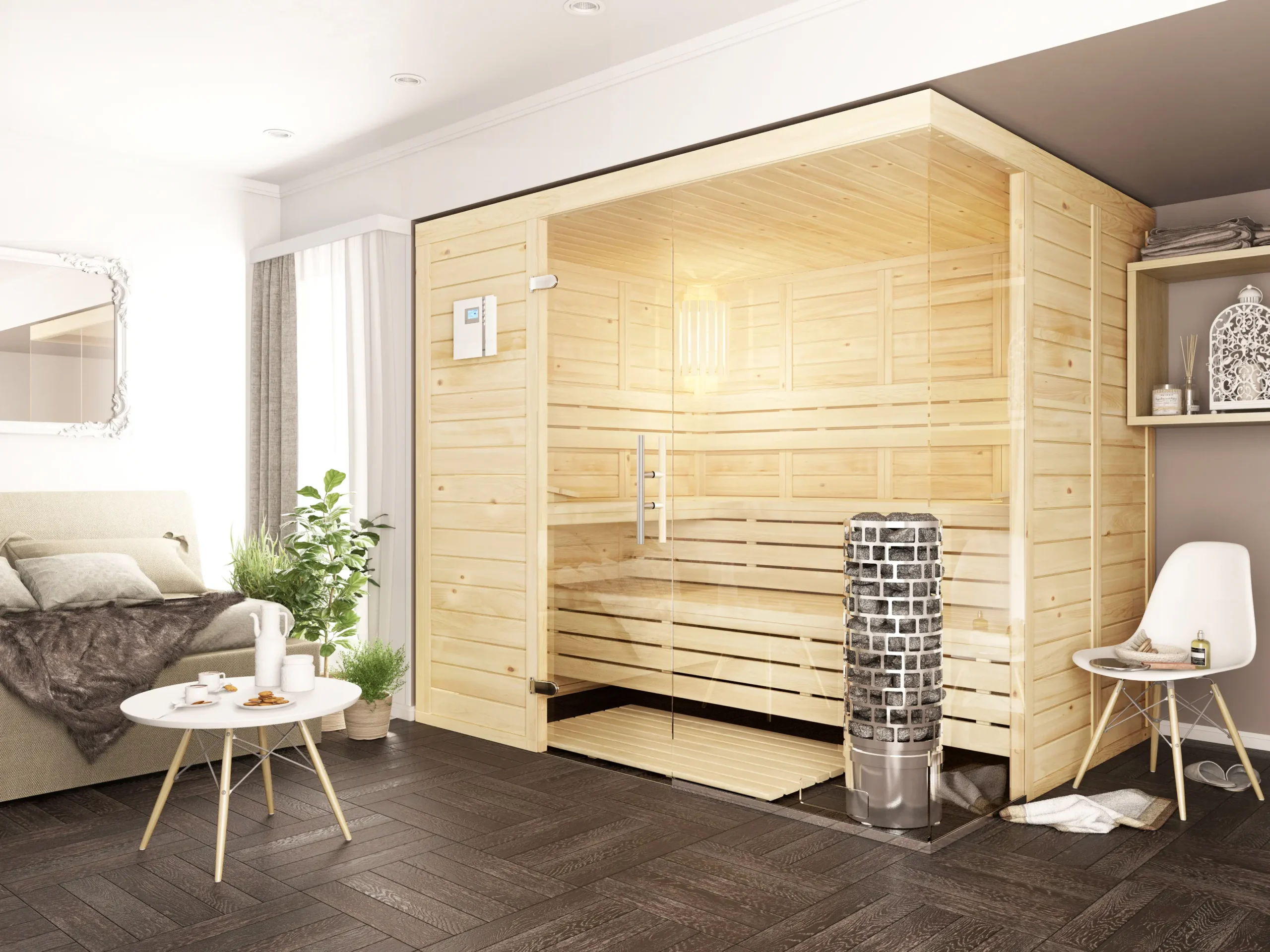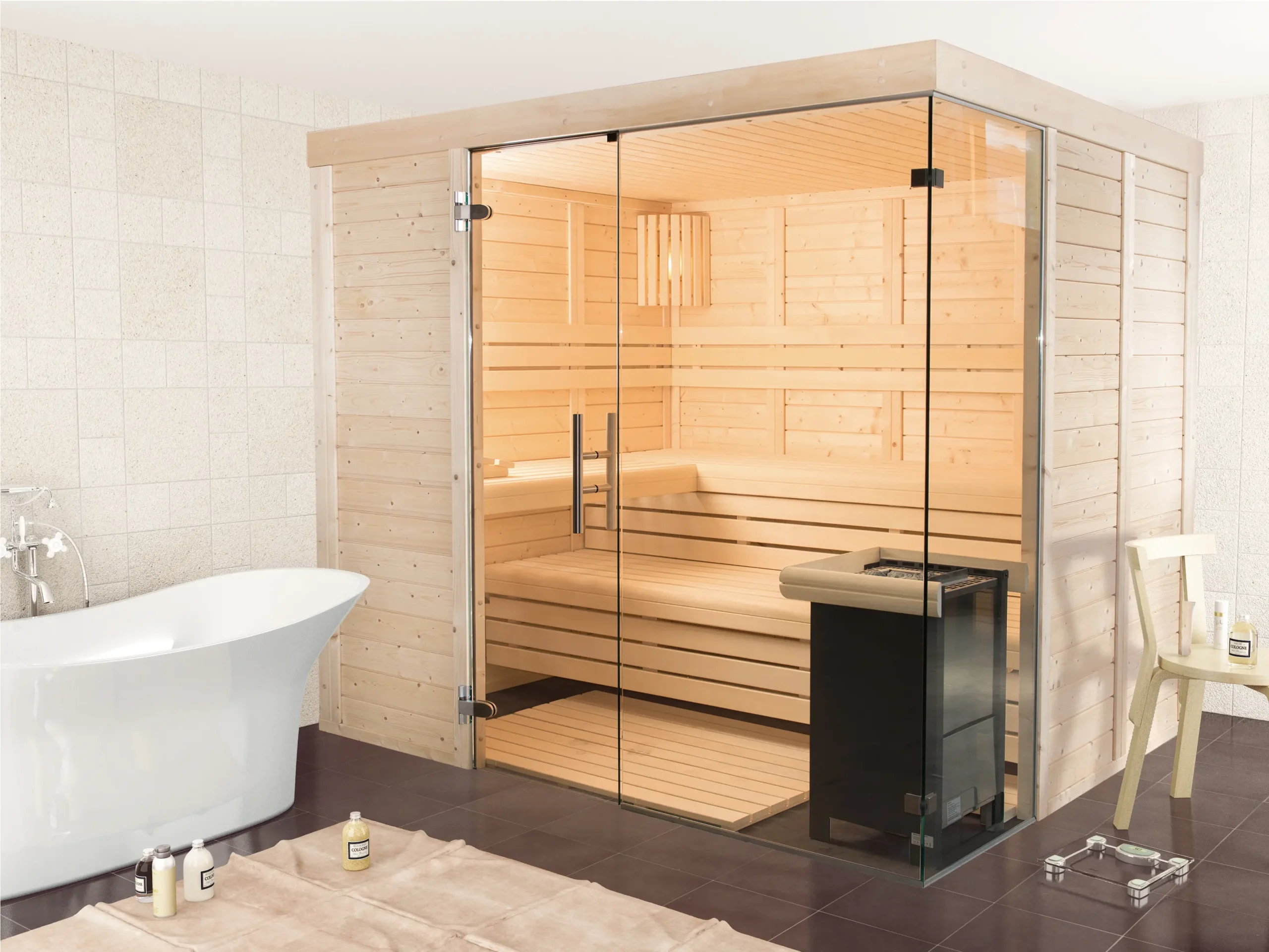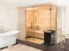 The BLOCKSTAR-G is a premium indoor sauna featuring a striking corner glass design that opens up the space visually while preserving warmth and privacy. Its refined interior includes ergonomic benches and softwood finishes, offering a luxurious sauna experience in a compact, architecturally distinctive form.