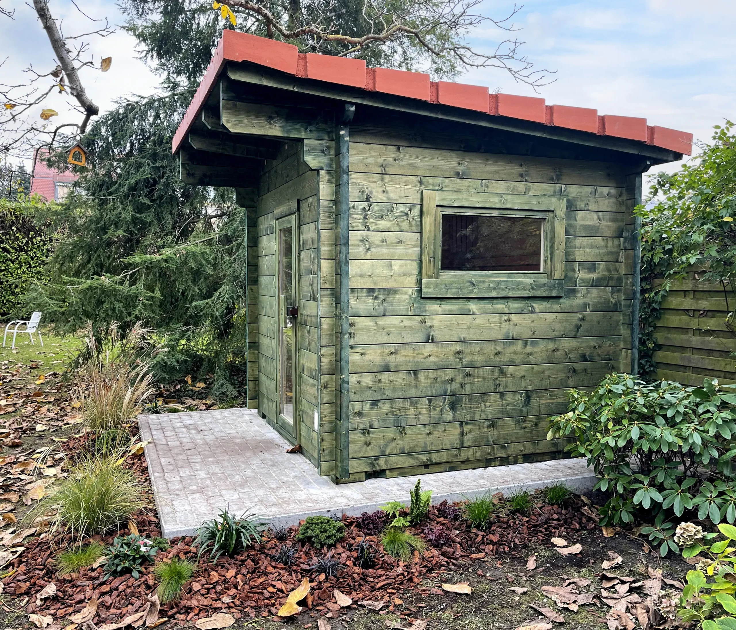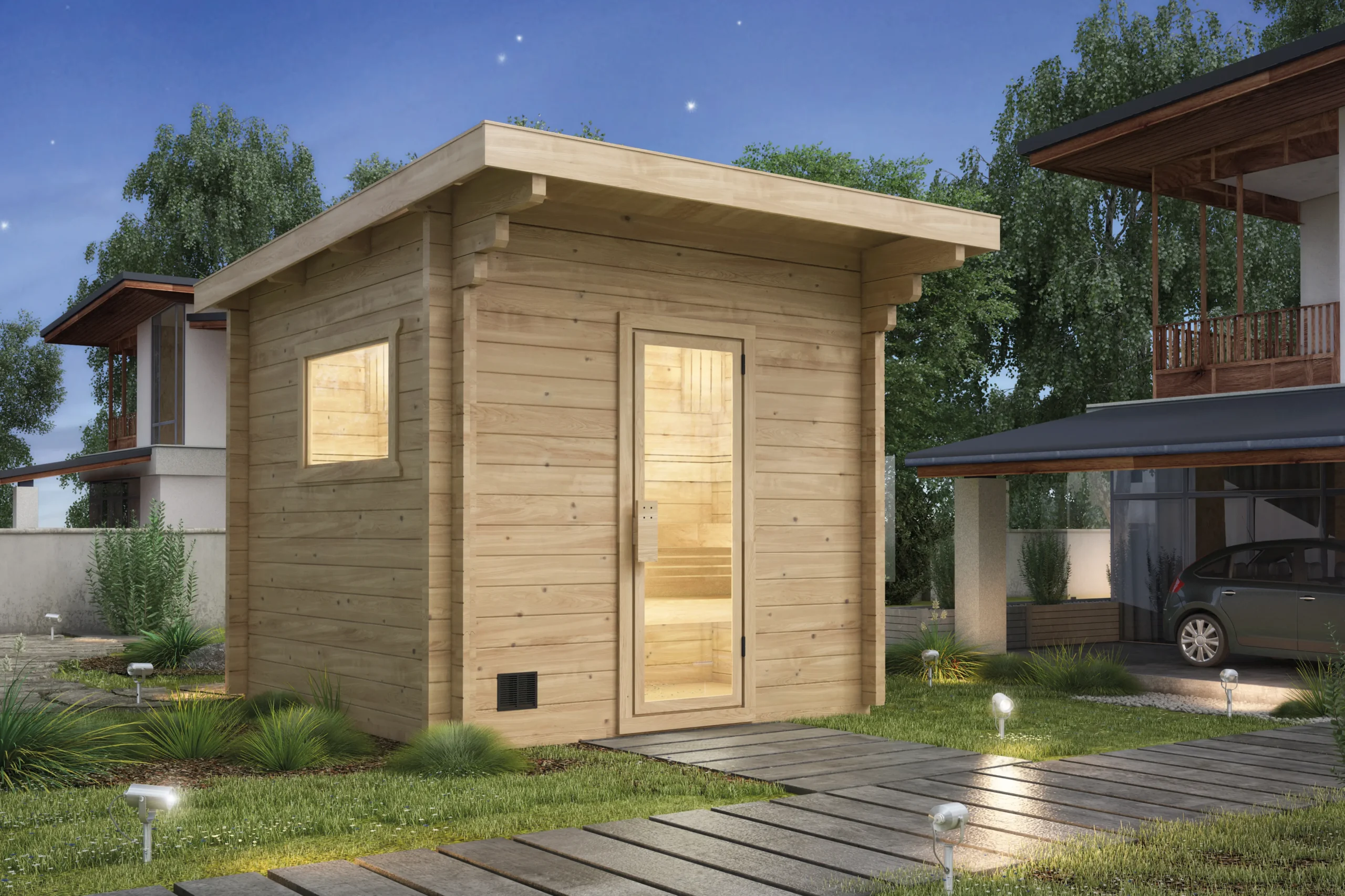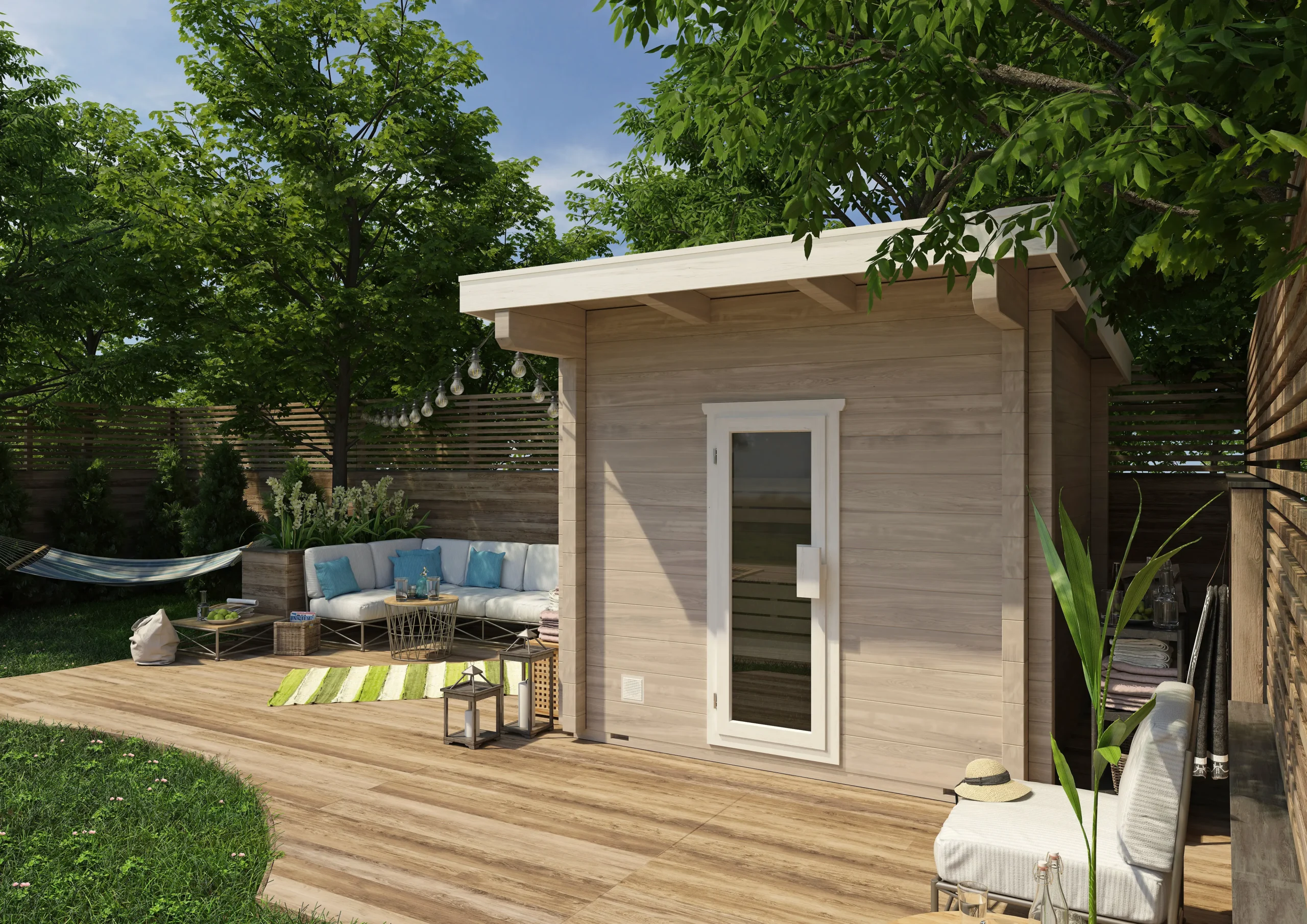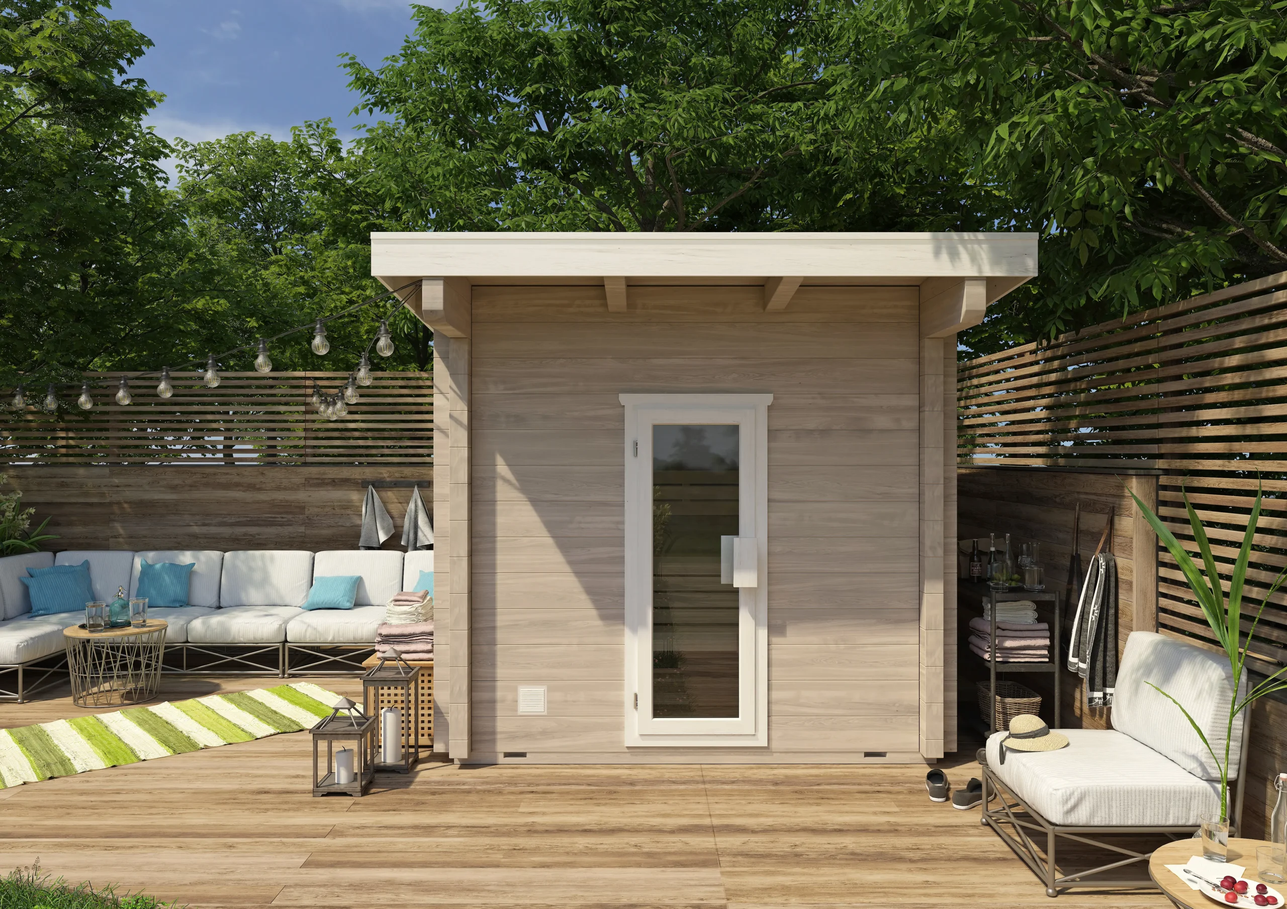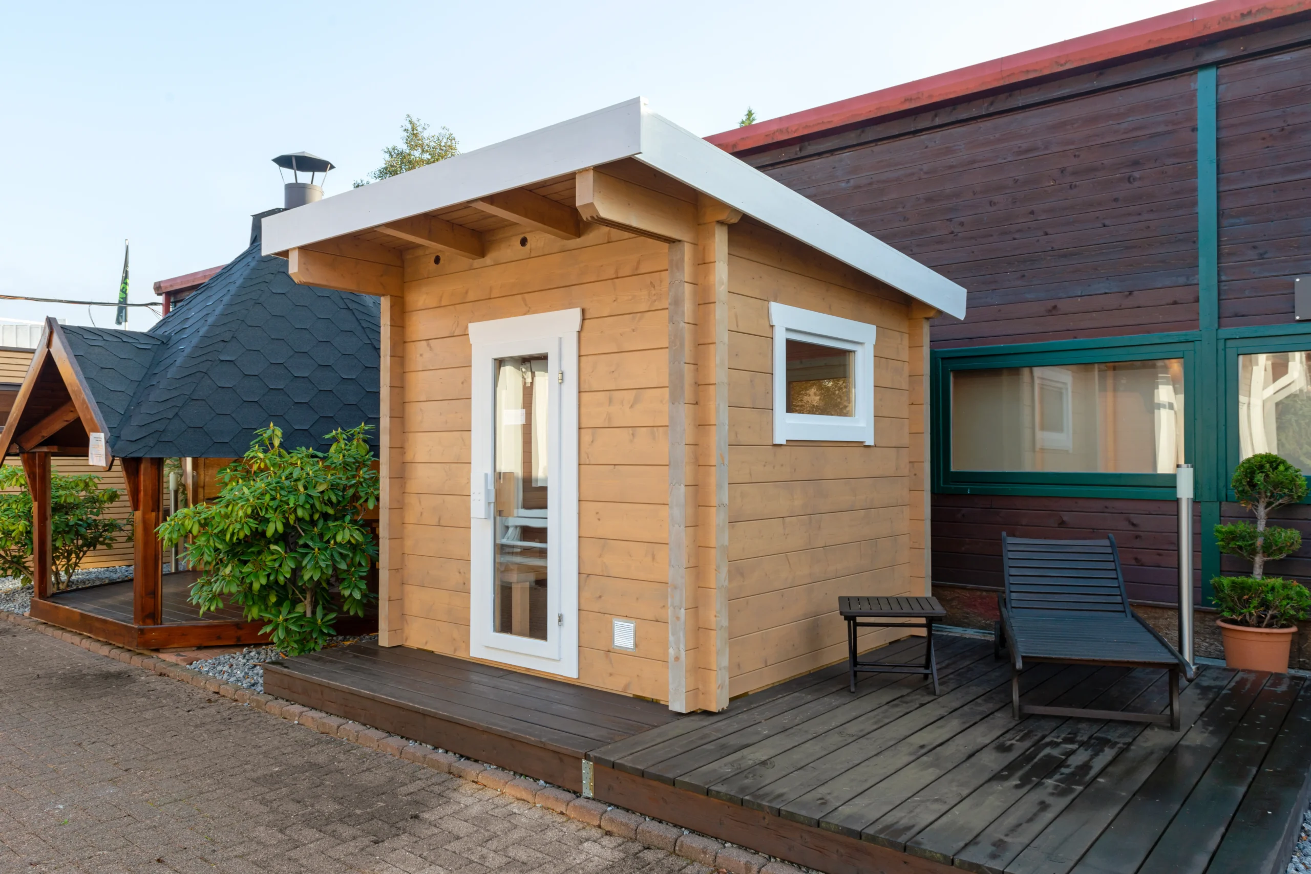 The BODENSEE-TWO reimagines the original with a flat, single-sloped roof for a more contemporary look. Its horizontal timber cladding and large glass front create a bright, open atmosphere, while the insulated sauna room ensures year-round usability. With a clean silhouette and expanded interior, BODENSEE-TWO is perfect for modern gardens or boutique wellness spaces.