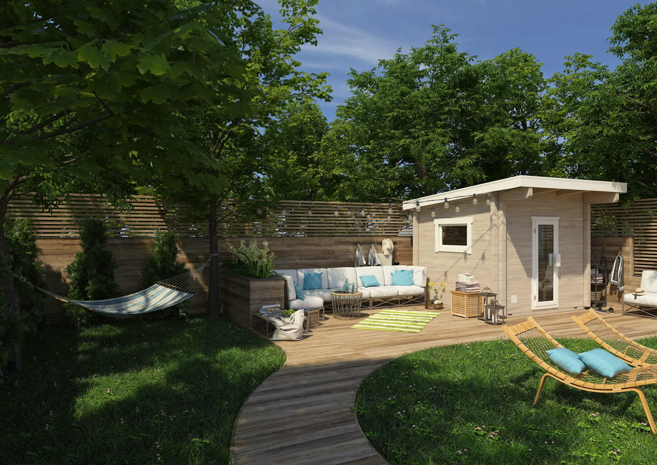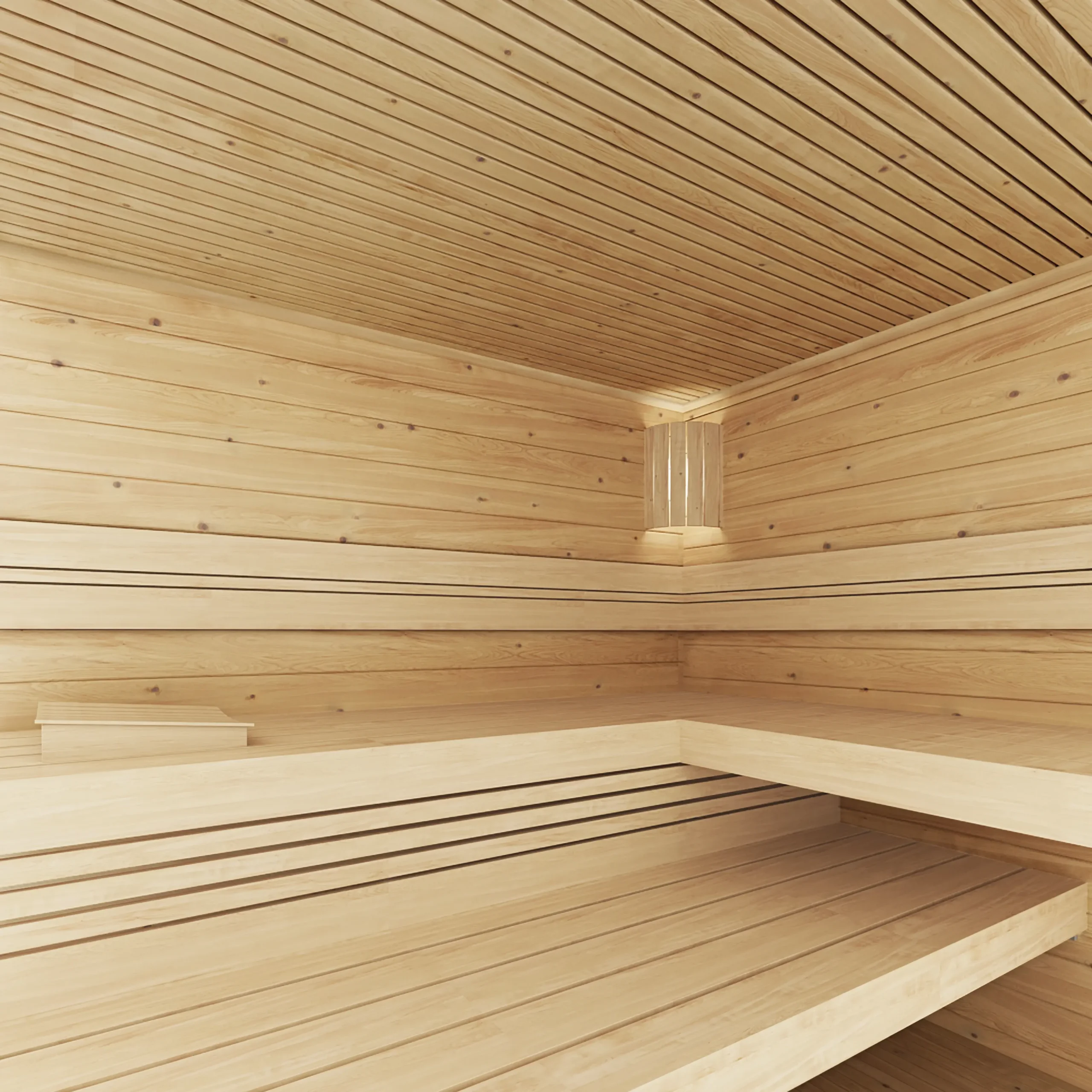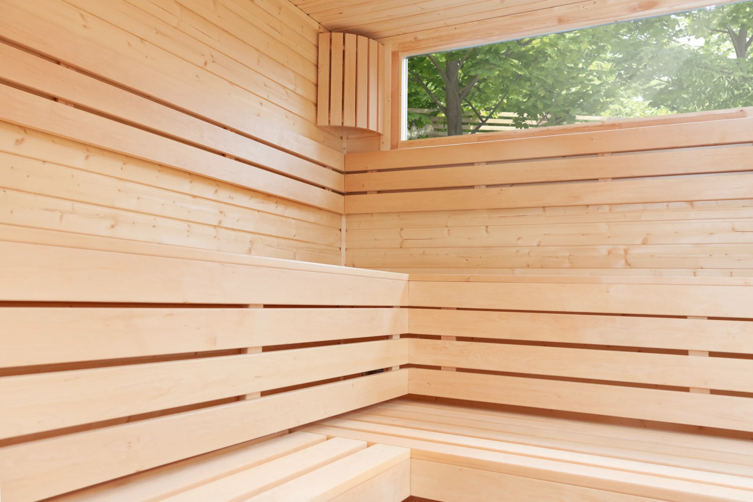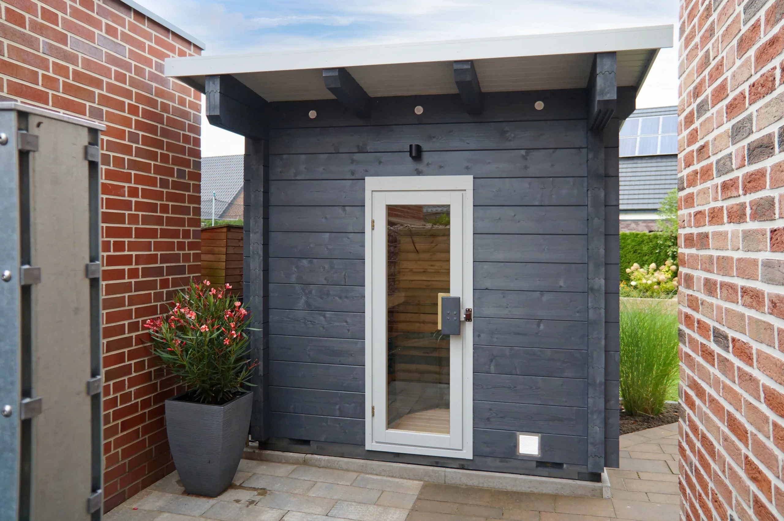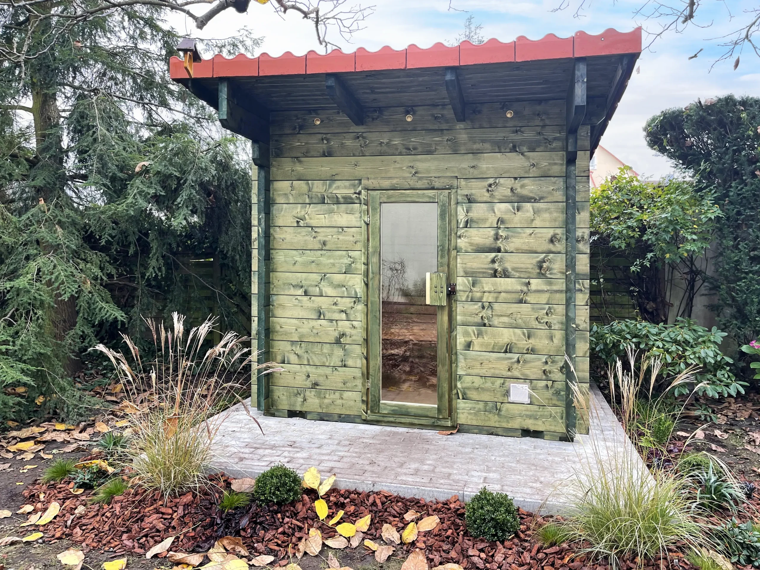 The BODENSEE-TWO reimagines the original with a flat, single-sloped roof for a more contemporary look. Its horizontal timber cladding and large glass front create a bright, open atmosphere, while the insulated sauna room ensures year-round usability. With a clean silhouette and expanded interior, BODENSEE-TWO is perfect for modern gardens or boutique wellness spaces.