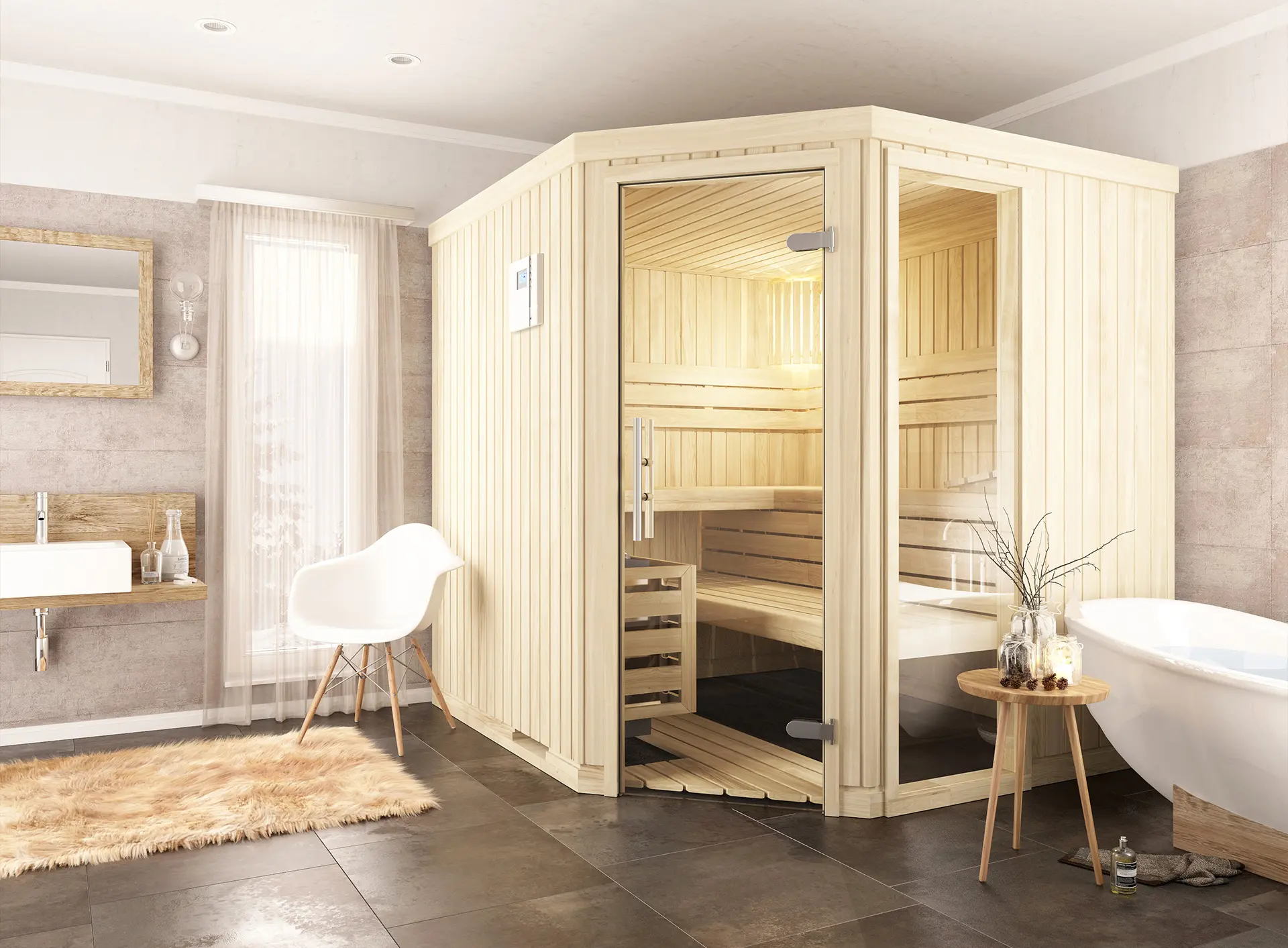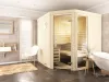 Designed for corner installation, the CLASSIC-C with corner entry offers a smart layout that saves space while maintaining a generous interior feel. Its angled design allows for flexible placement in compact rooms, and the natural wood finish adds warmth and elegance. With ergonomic benches and thoughtful detailing, this model is ideal for homeowners seeking a practical yet stylish sauna experience.