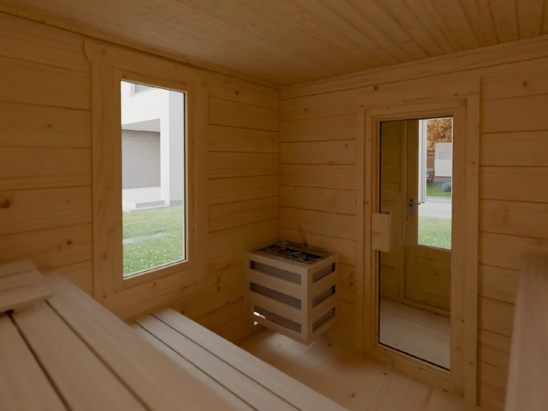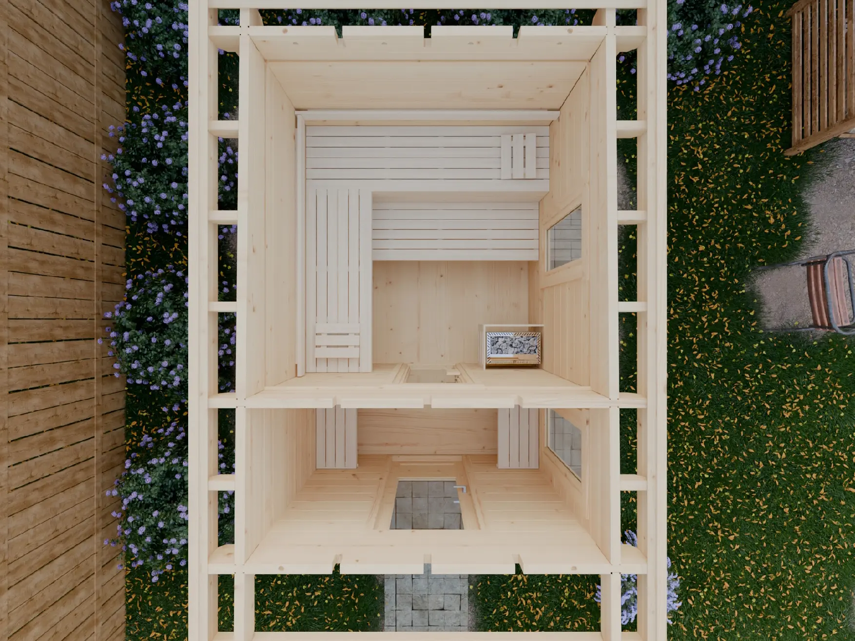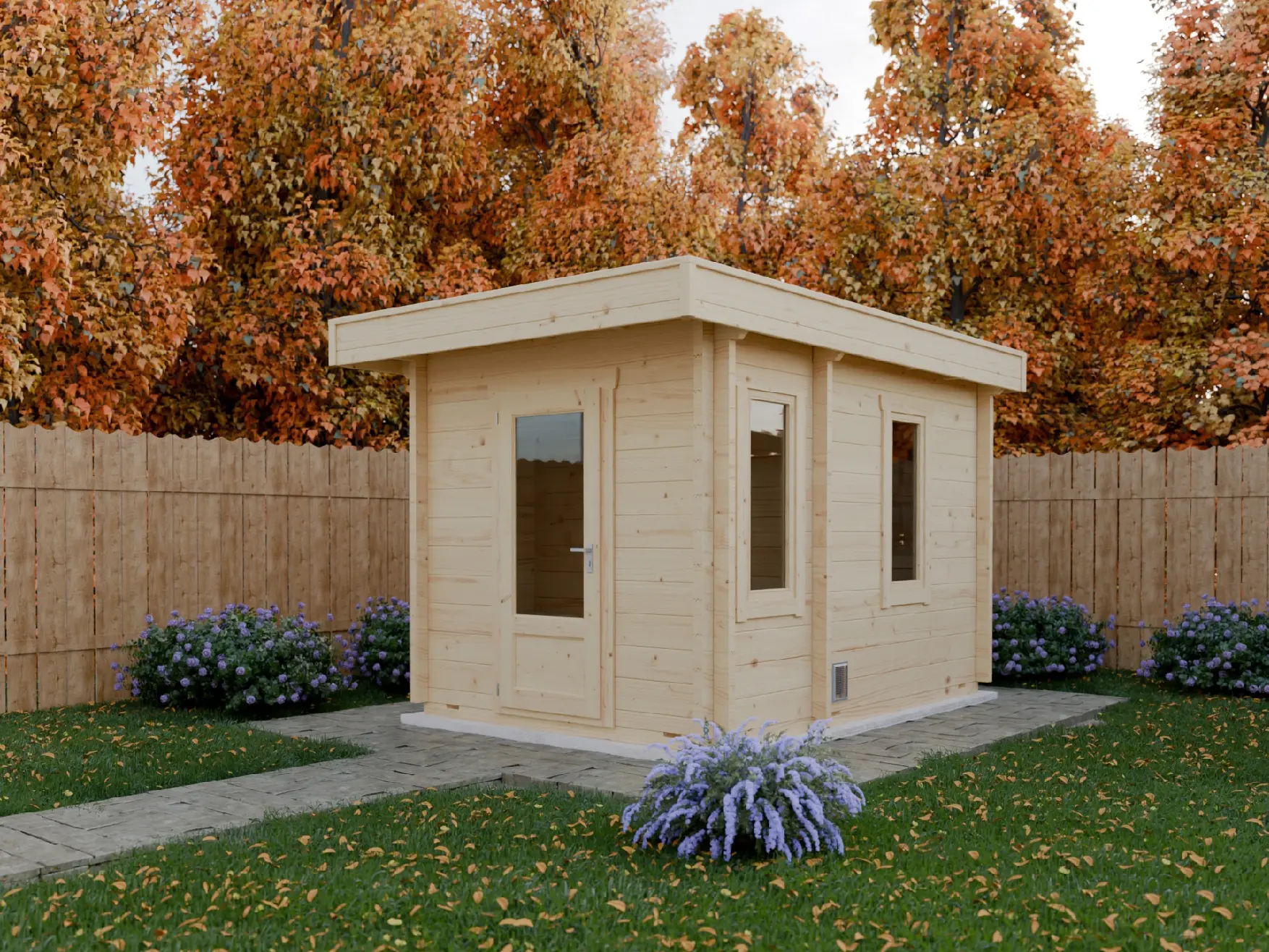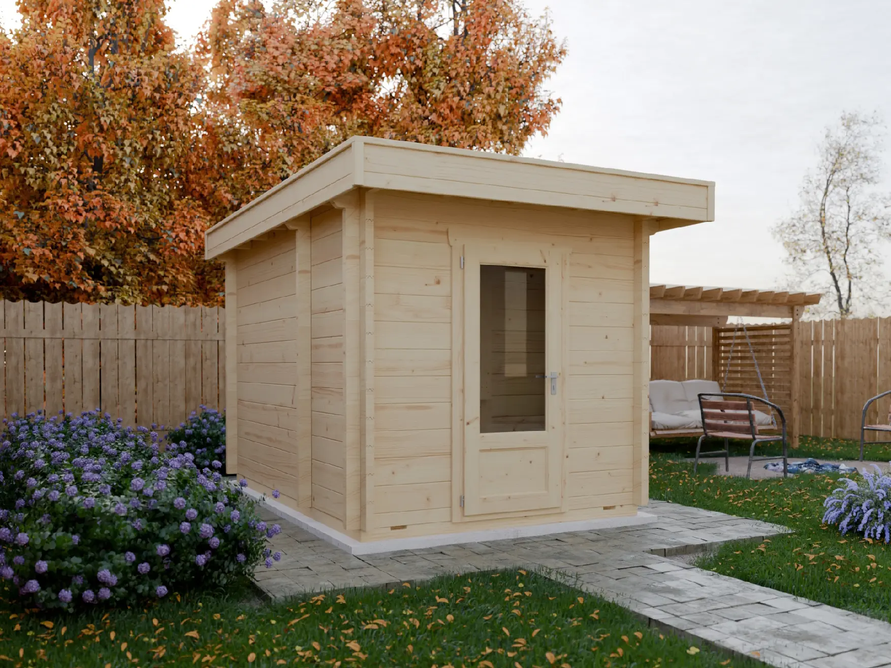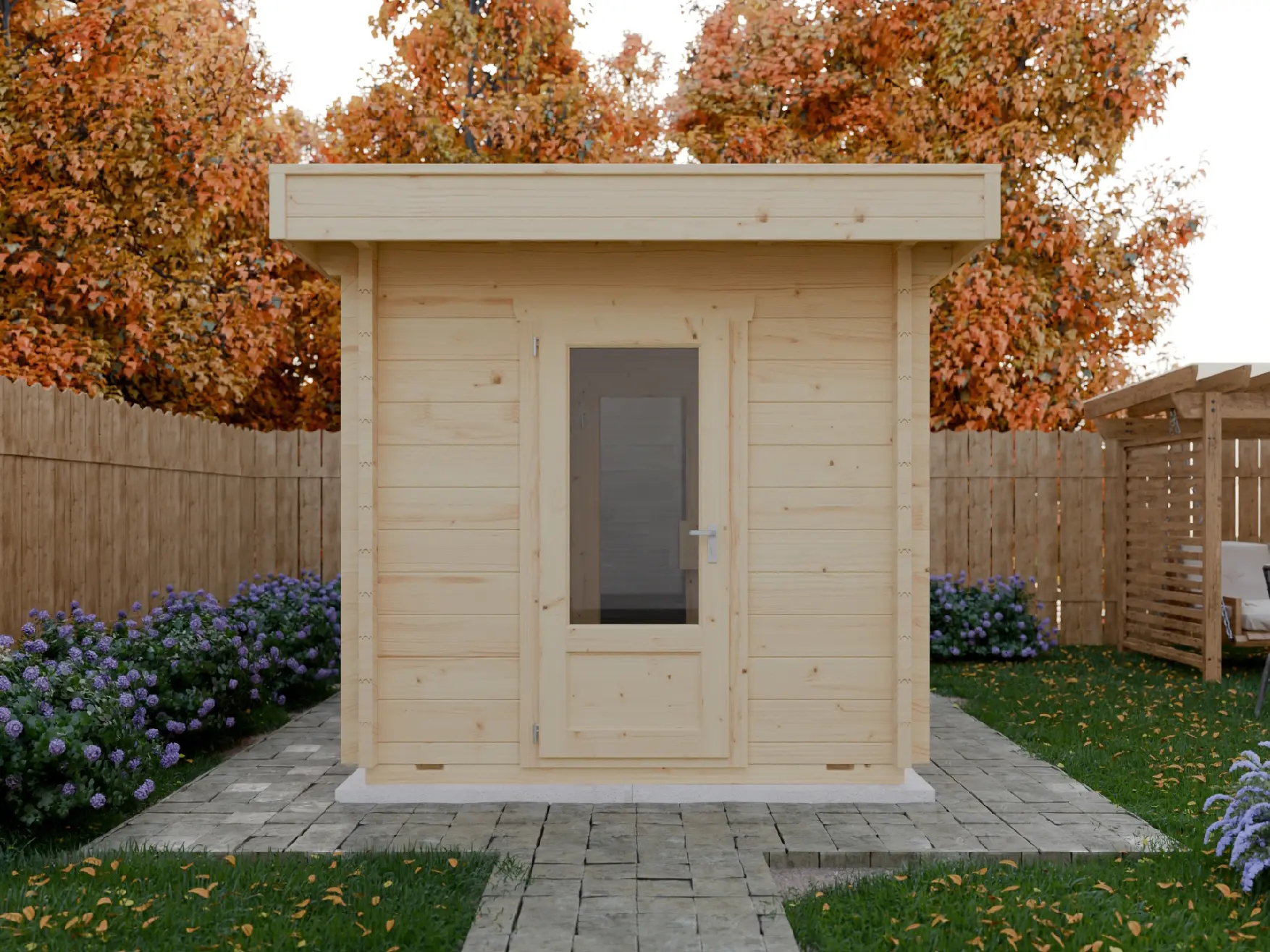 The DORA is a space-efficient garden sauna with a flat, single-sloped roof and a linear walk-through layout. Designed for narrow or compact plots, it includes a separate antechamber and an insulated sauna room with softwood finishes. Its horizontal timber cladding and clean lines create a modern look, while the thoughtful layout ensures comfort even in limited spaces-ideal for urban gardens or tight wellness zones.