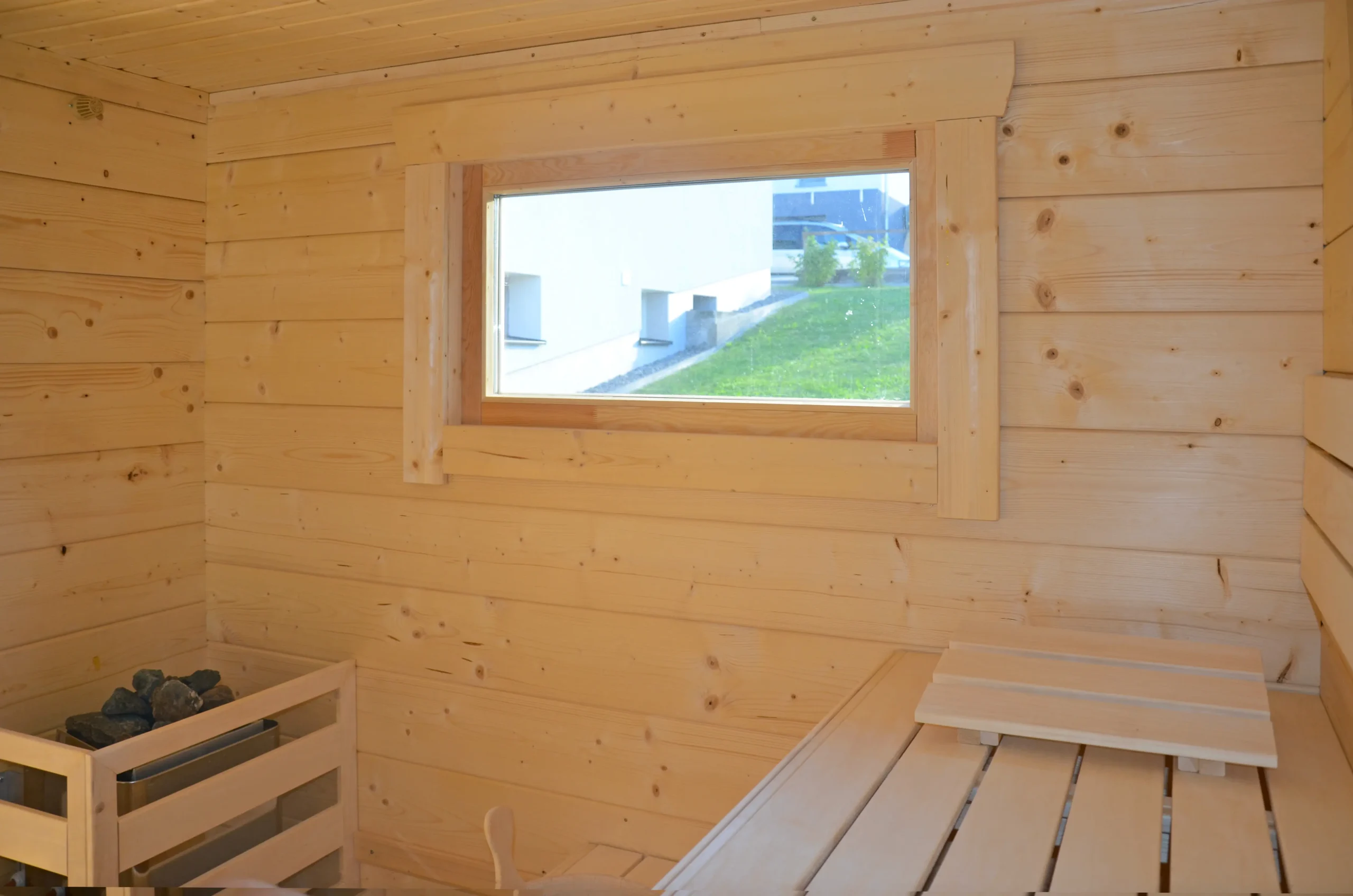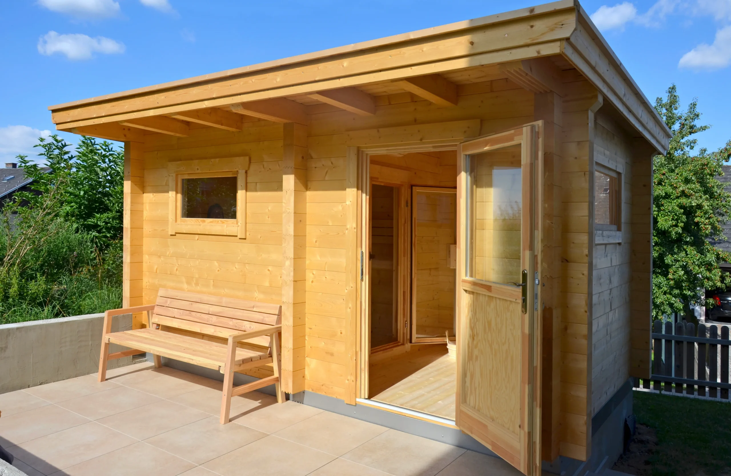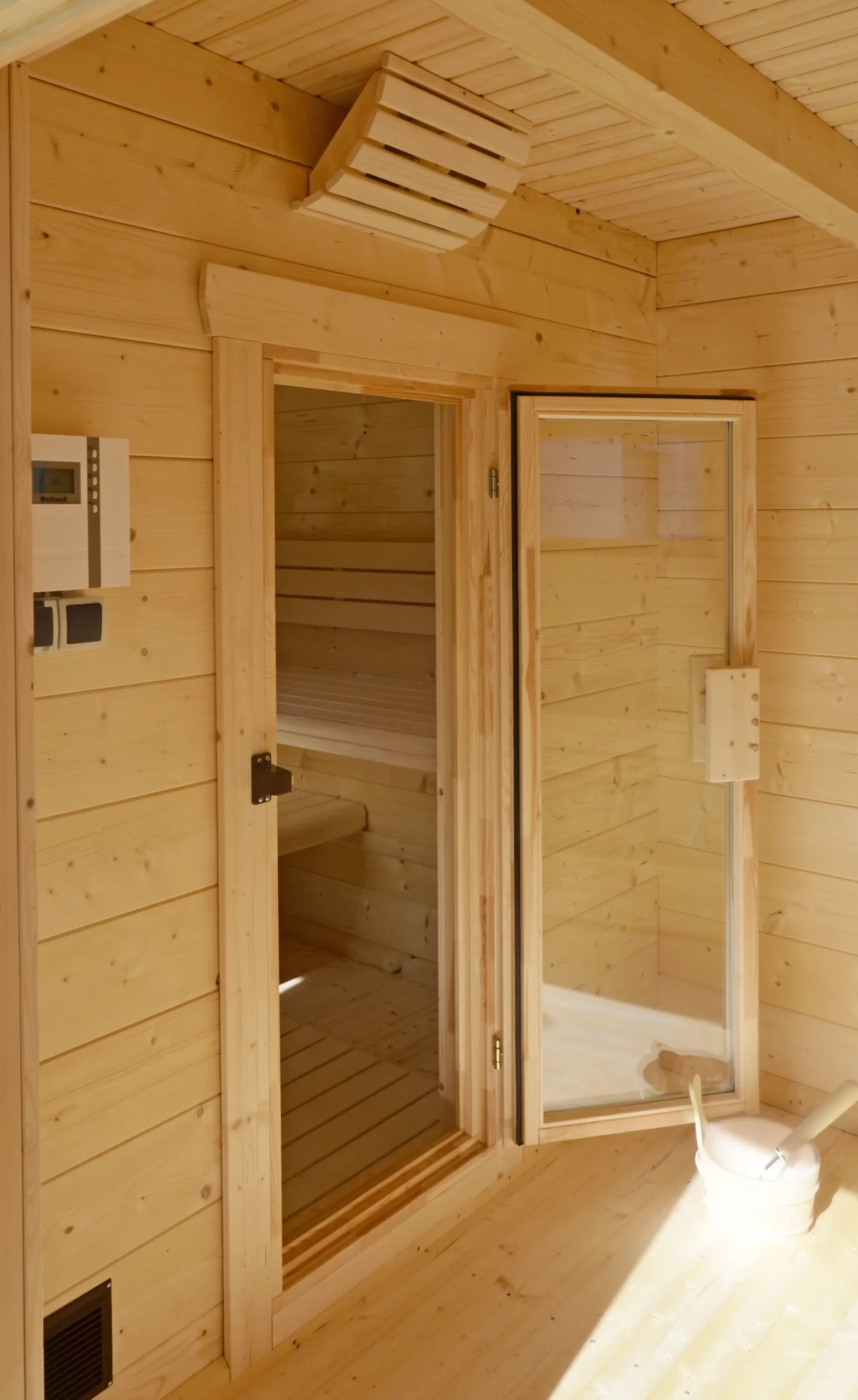 The EIBSEE is an expanded version of the BODENSEE 2, offering additional space and functionality. Its layout includes a separate antechamber for changing or storage, while the sauna room features softwood finishes and full insulation for a cozy, private retreat. With a flat, single-pitch roof and horizontal cladding, EIBSEE is ideal for residential wellness zones or hospitality settings seeking comfort and versatility.