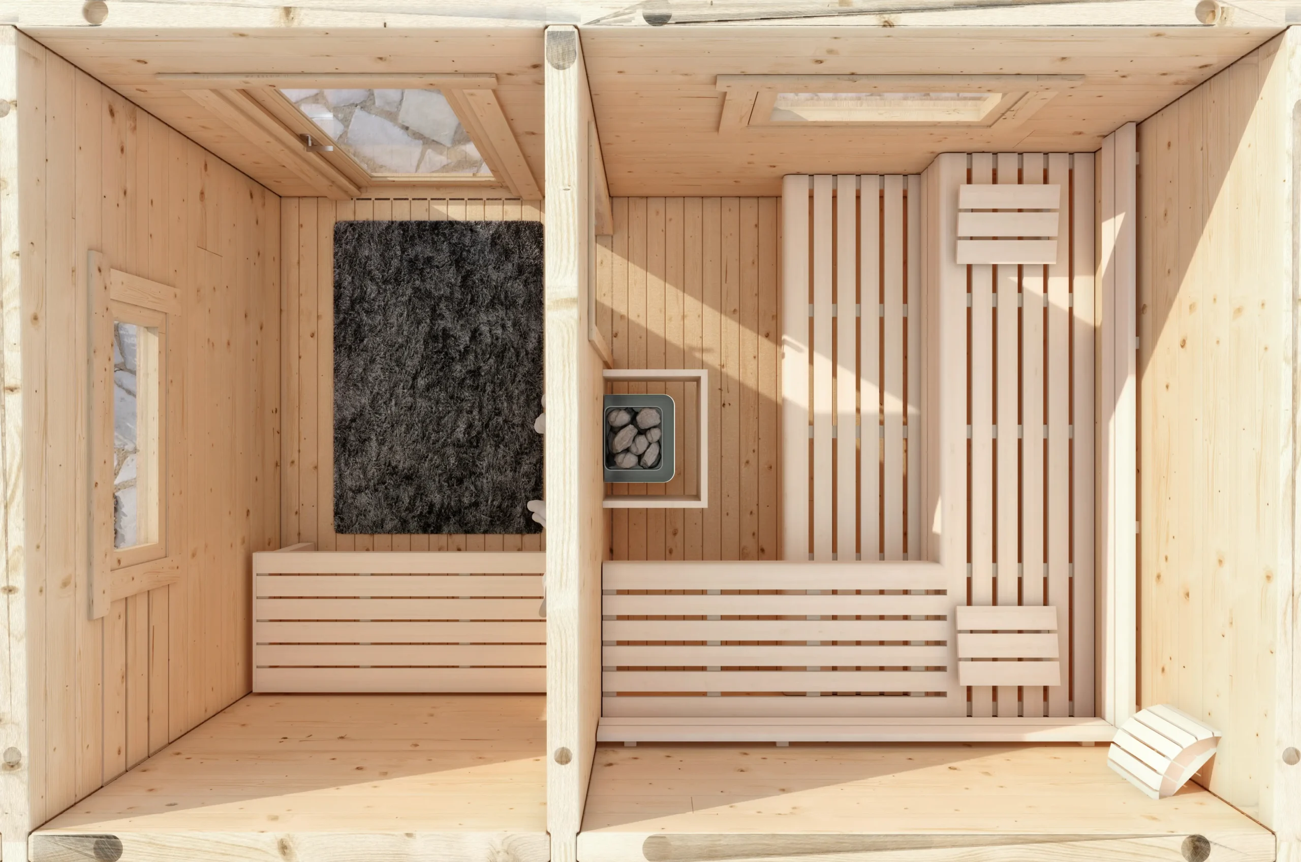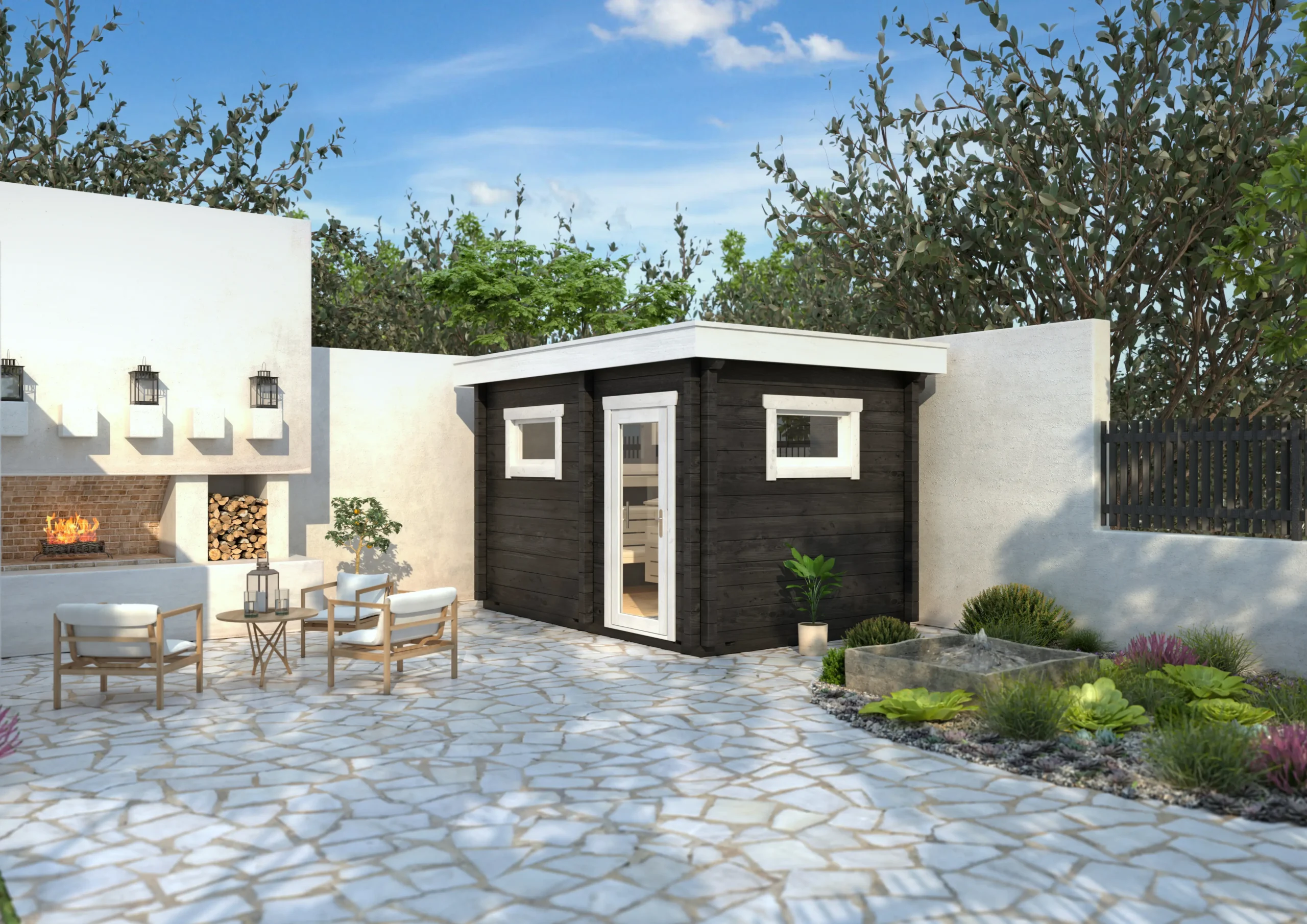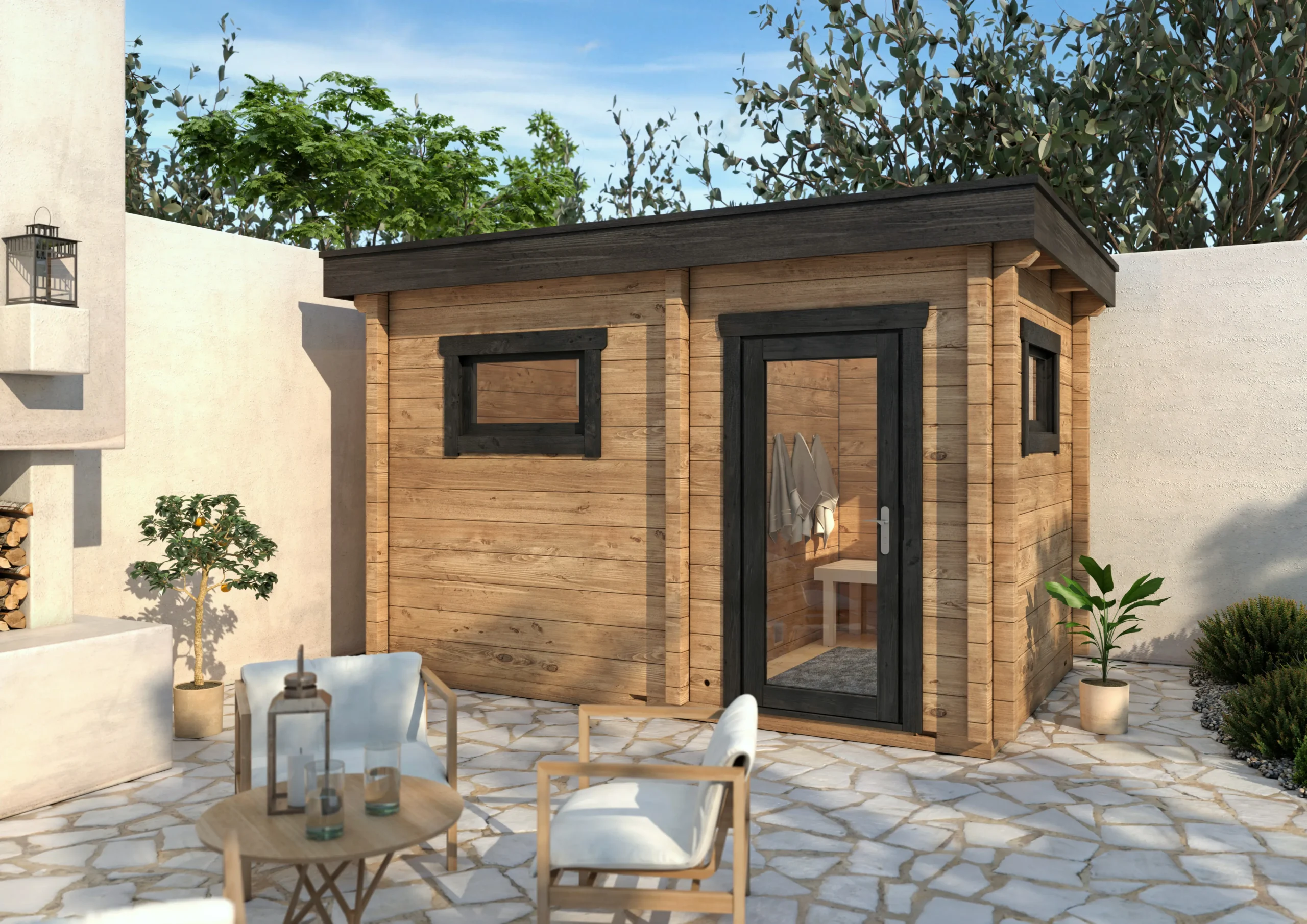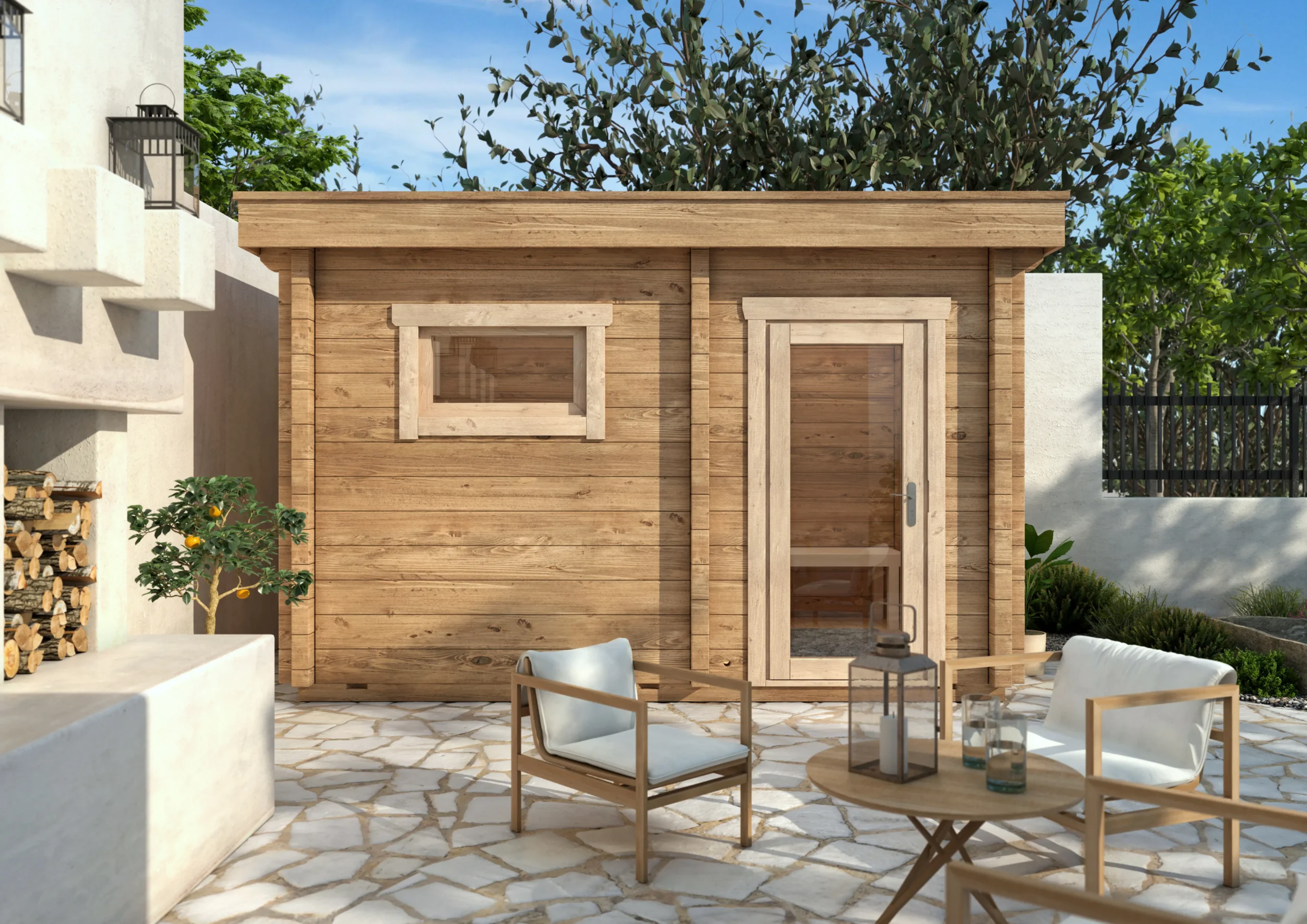 The FUN-L is a compact garden sauna designed for privacy and comfort. Its layout includes a separate antechamber for changing or storage, while the sauna room features a high-placed window that allows natural light in without compromising seclusion. With horizontal timber cladding, a flat roof, and full insulation, FUN-L is ideal for modern gardens or wellness spaces where discretion and relaxation go hand in hand.
