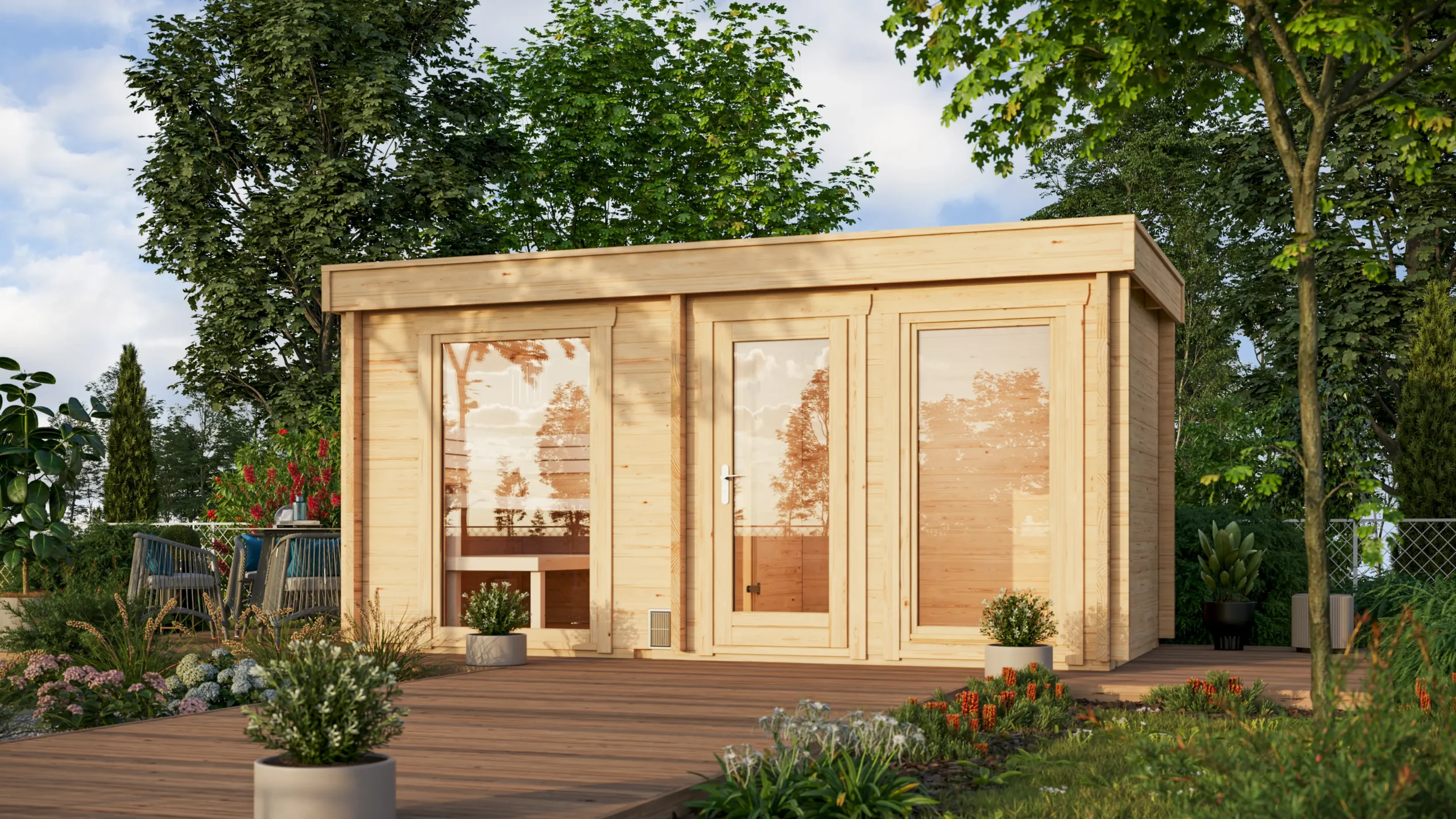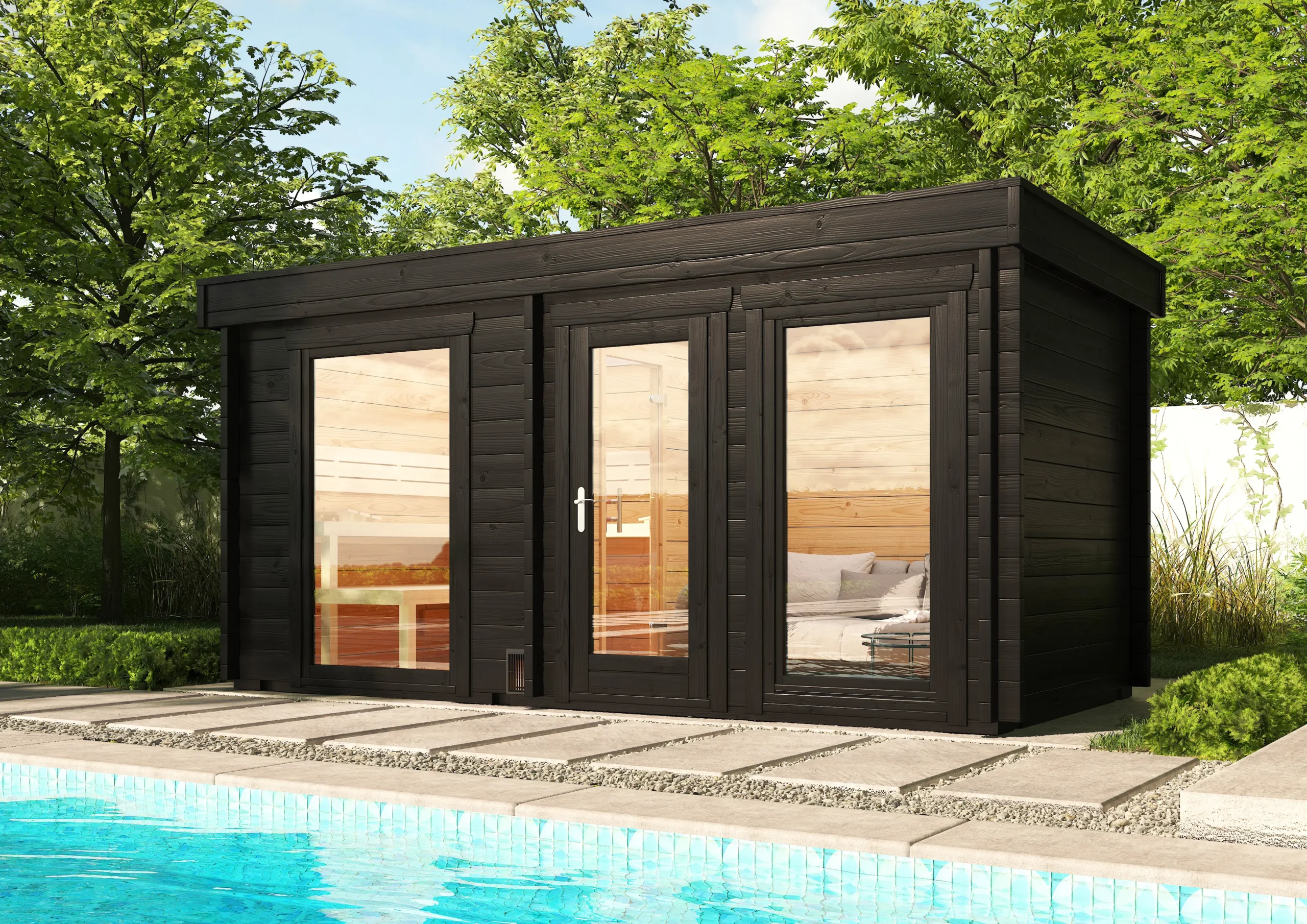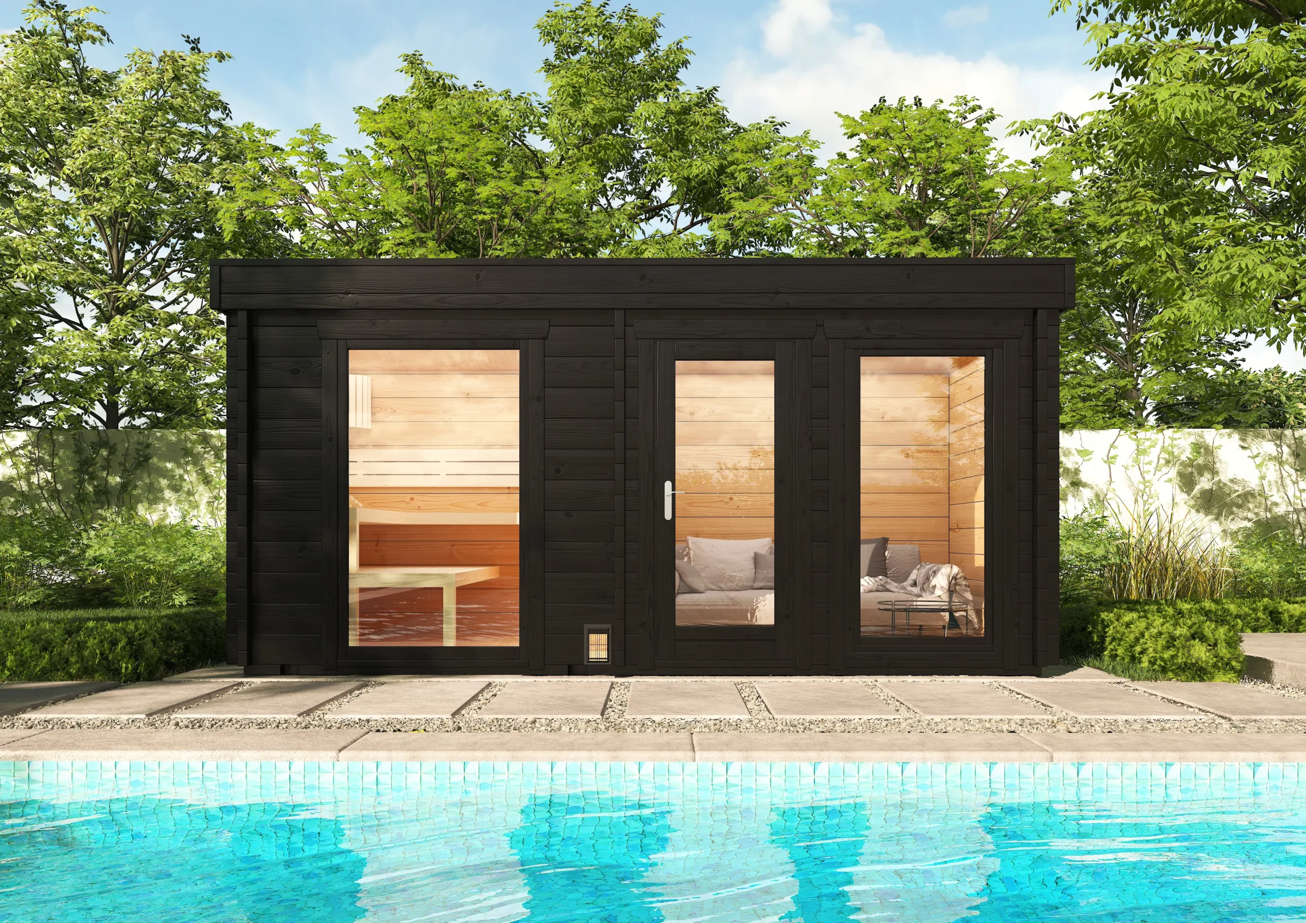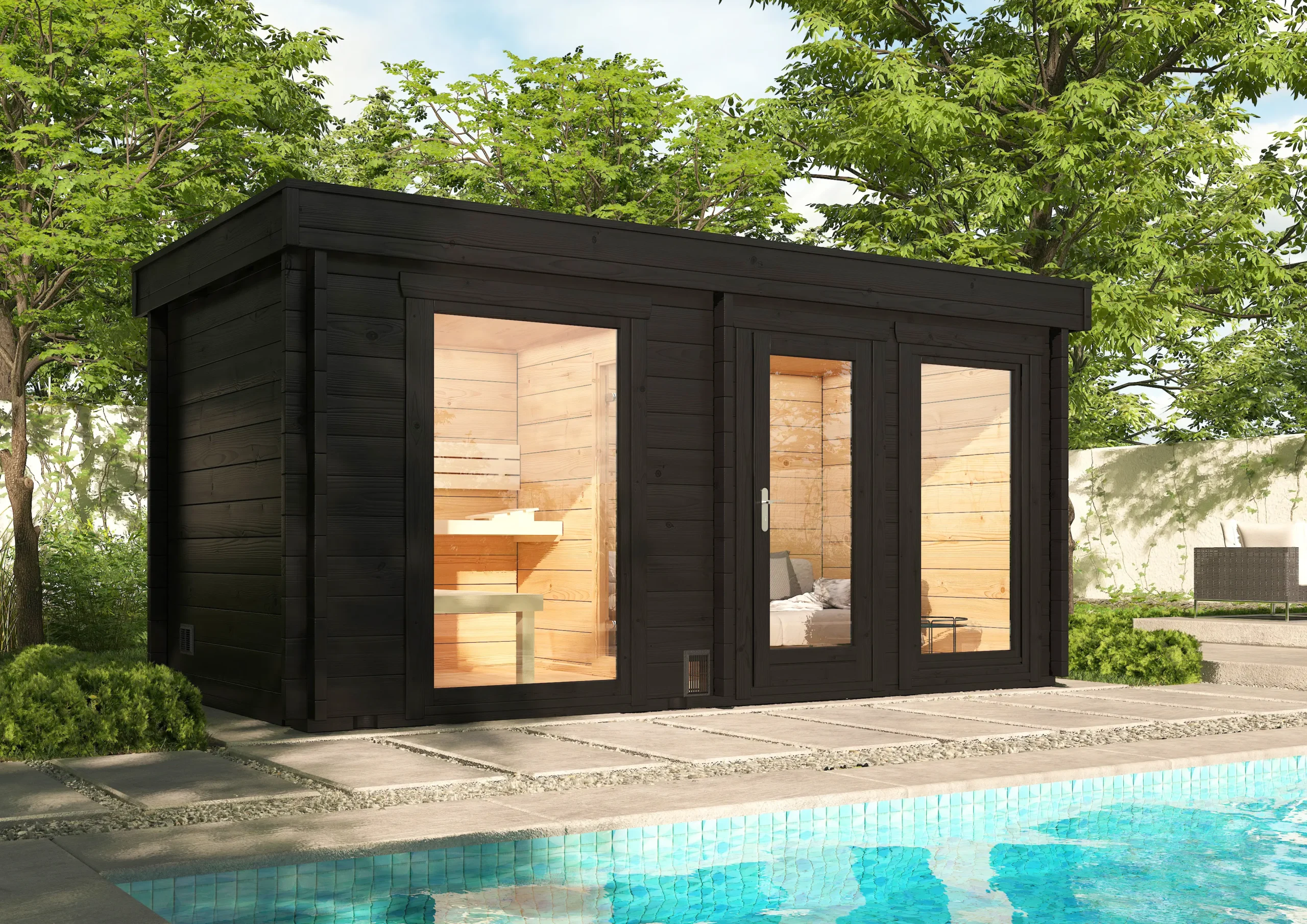 The FUNNY-4823 builds on the 3723 model with a larger footprint and the same practical two-room layout. A separate antechamber provides space for changing or storage, while the insulated sauna room offers a cozy retreat with softwood interiors. With its flat roof and horizontal cladding, FUNNY-4823 is a refined choice for residential wellness areas or boutique outdoor spas.