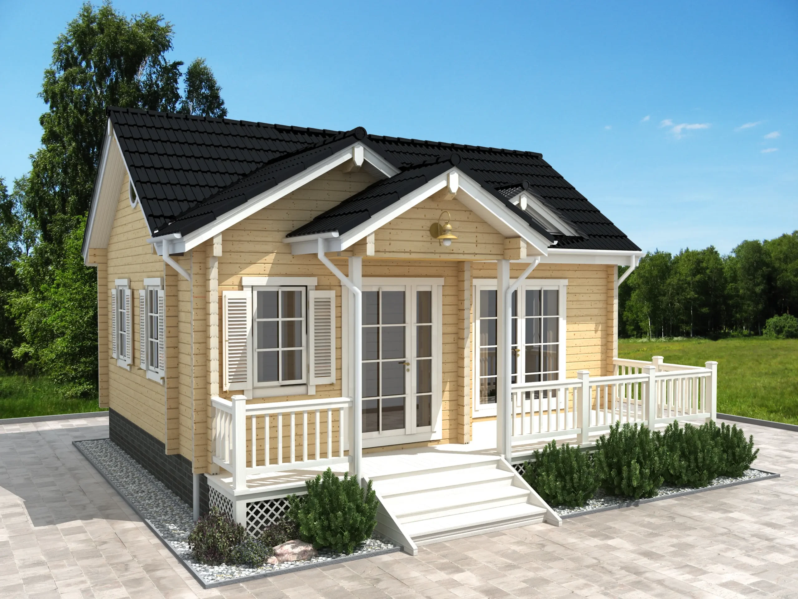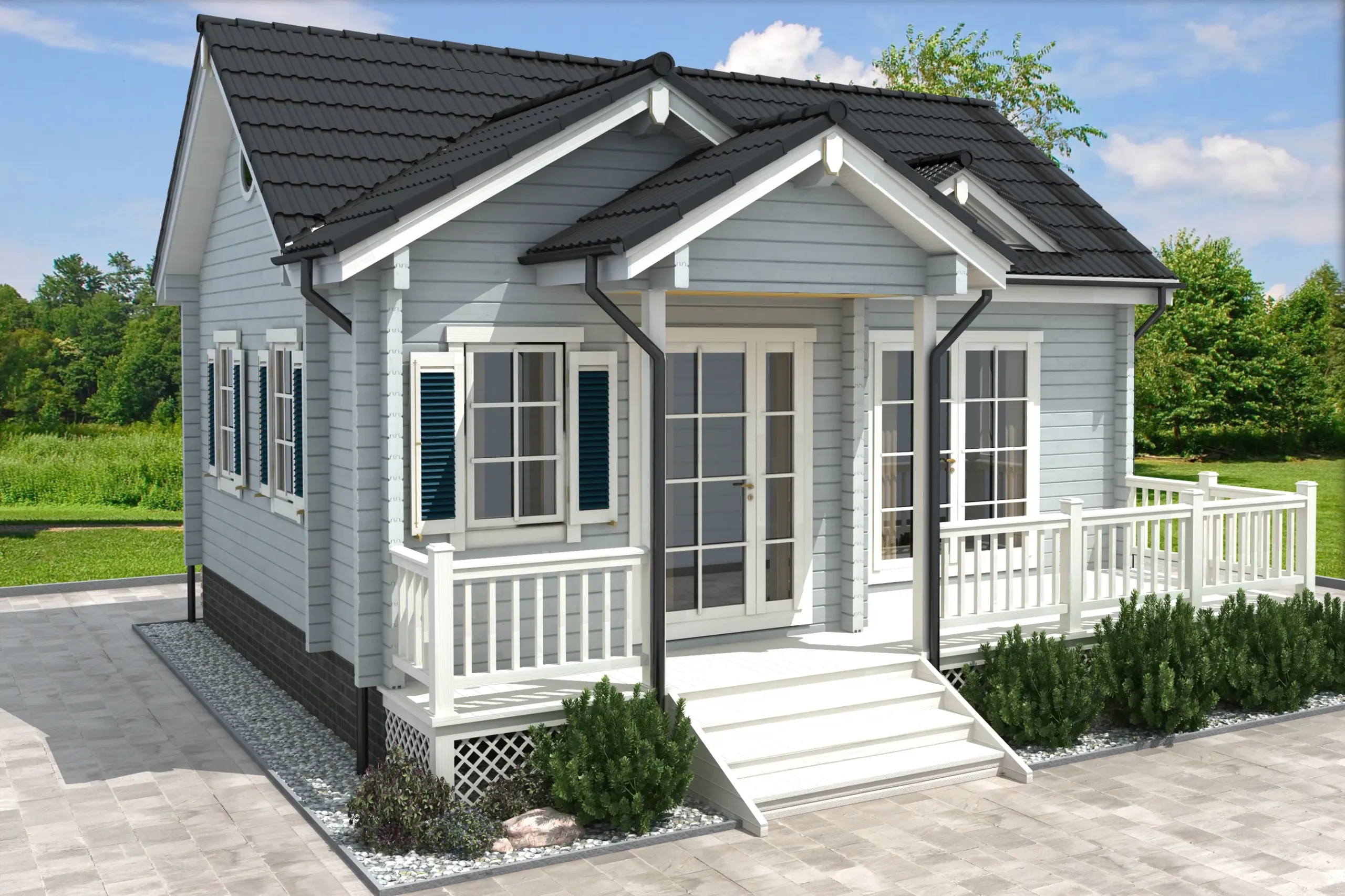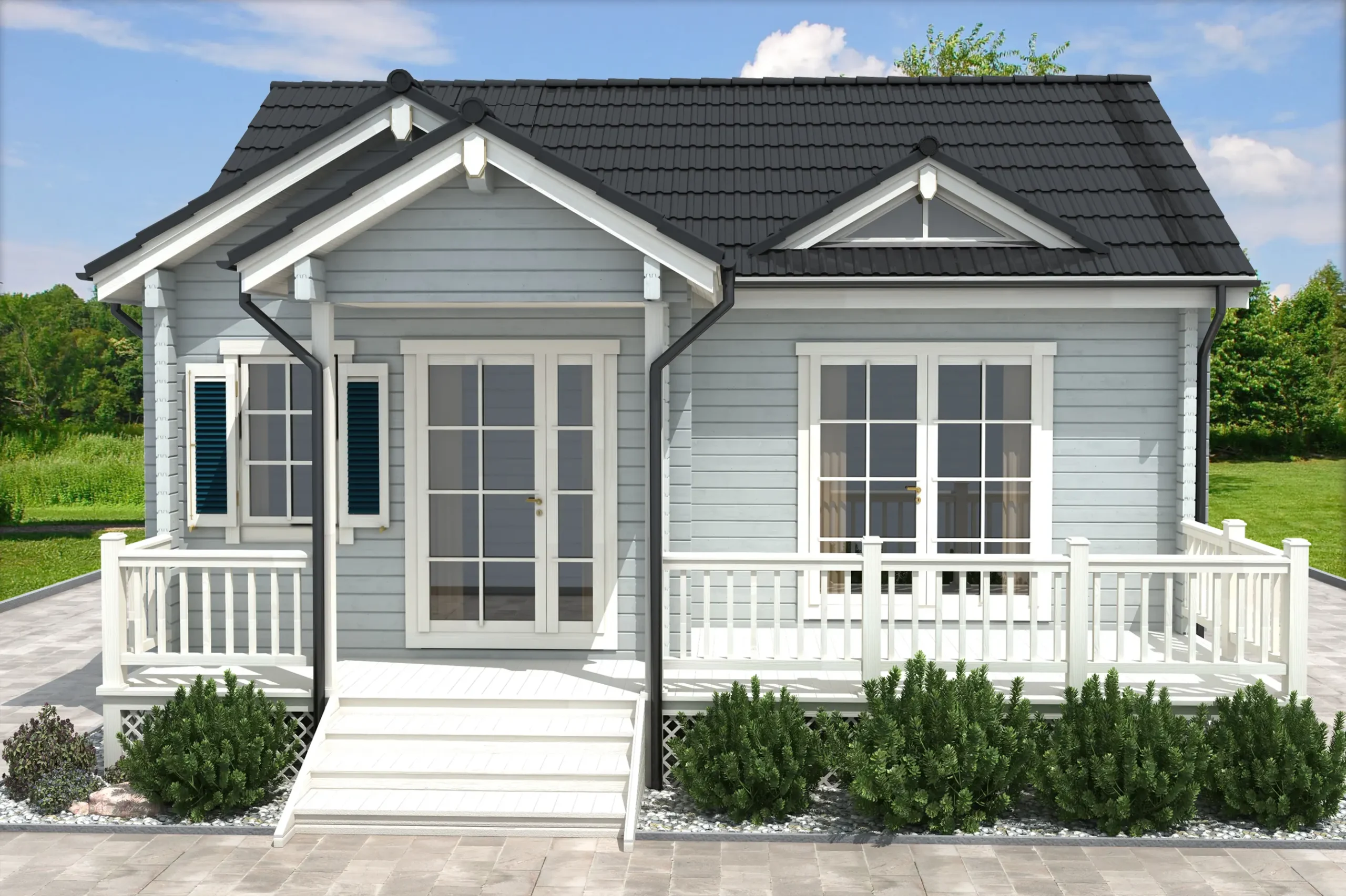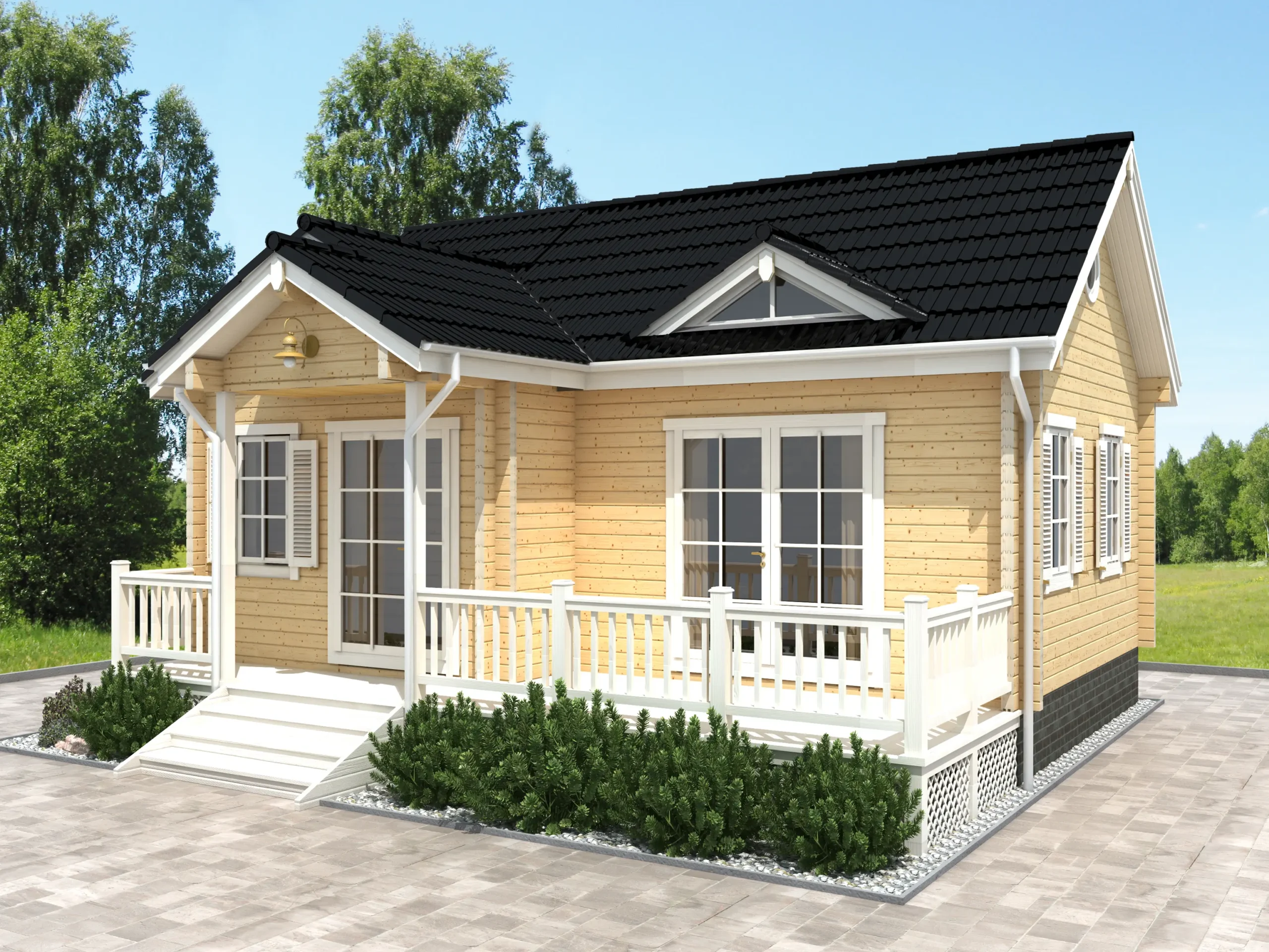 The INGRIDA-40 is a charming timber summer house with a distinctive silhouette and cozy design. Its veranda-style entrance and elevated windows create a warm, inviting atmosphere, while the interior includes one bedroom and a bathroom-perfect for couples or solo retreats. Optionally a loft style sleeping space can be added. Built for seasonal comfort and visual appeal, INGRIDA-40 is a standout choice for garden plots, lakeside escapes, or boutique rental use.