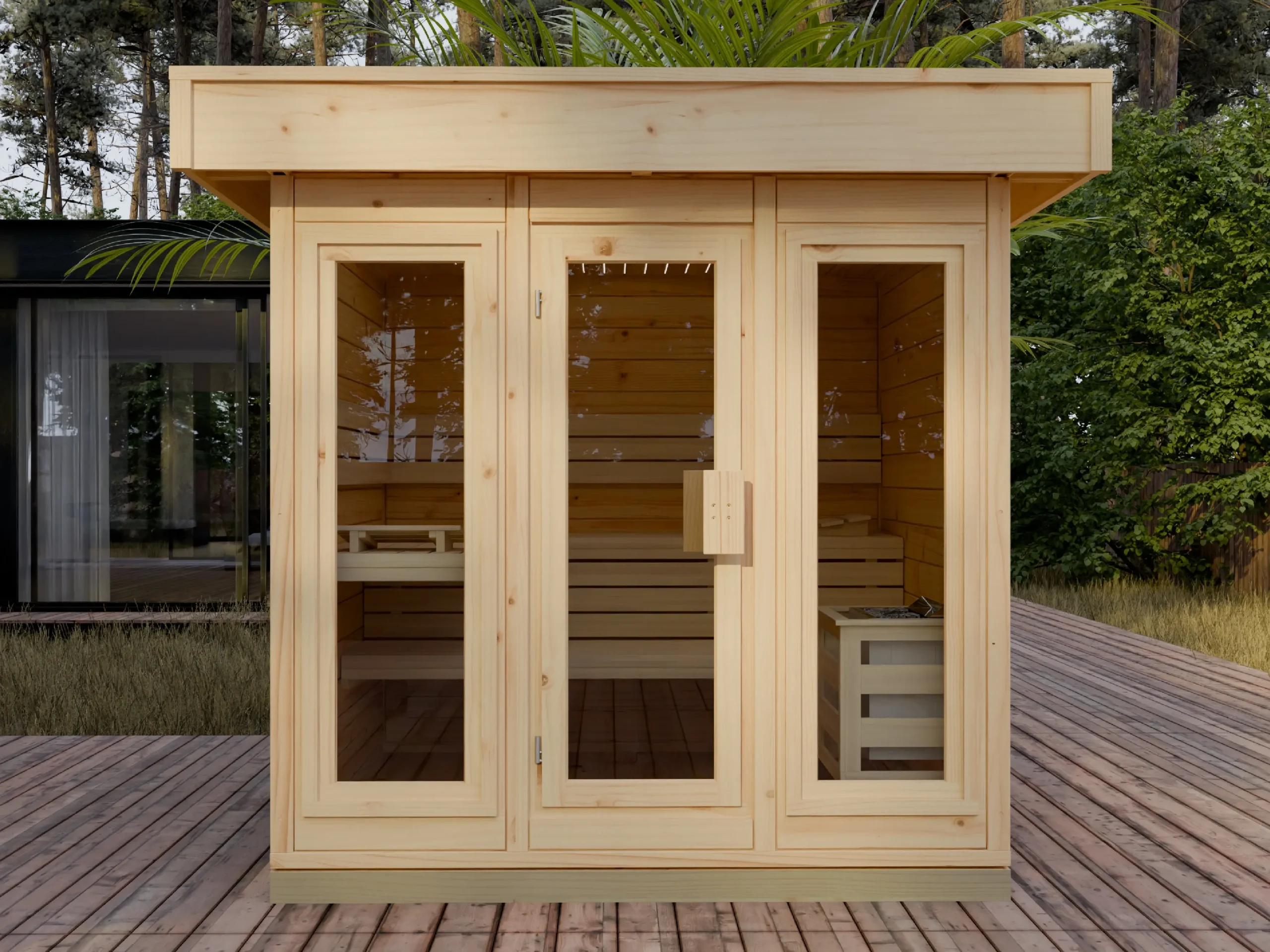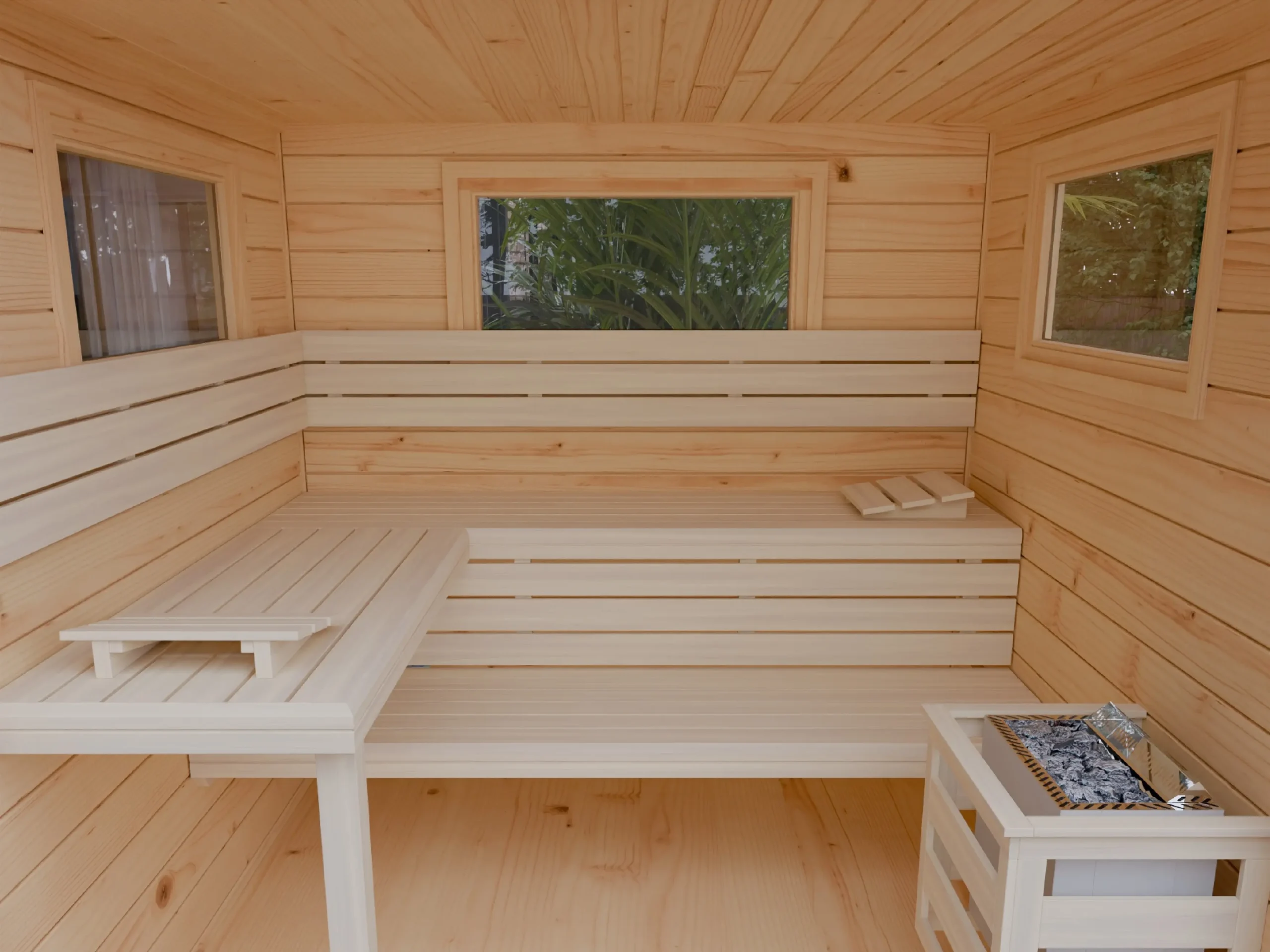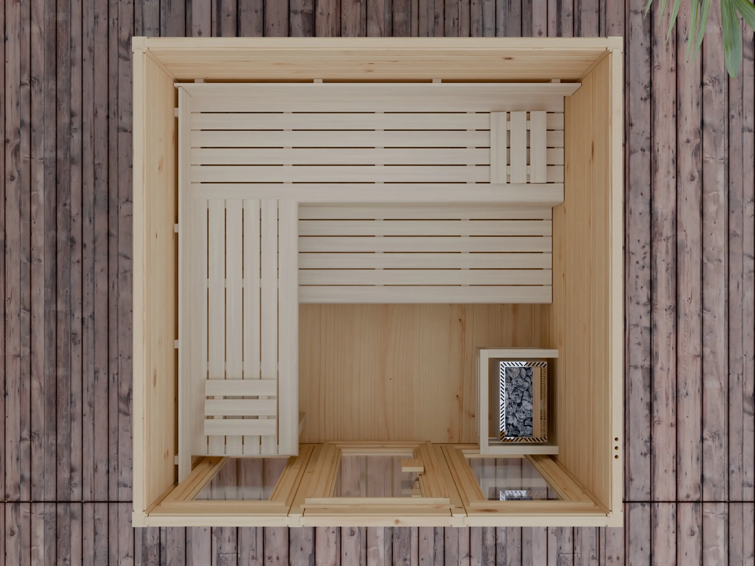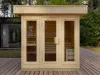 The JOY is a space-efficient corner sauna designed for modern outdoor environments. Its four-sided layout fits neatly into garden plots or patio corners, while the insulated timber frame ensures excellent heat retention. Inside, ergonomic benches and softwood finishes create a relaxing atmosphere. Ideal for private wellness use or compact hospitality installations, JOY delivers comfort and style in a smart, space-saving design.