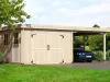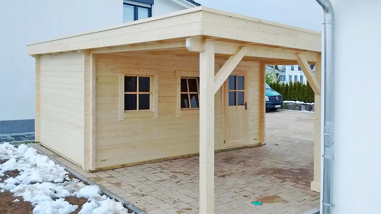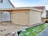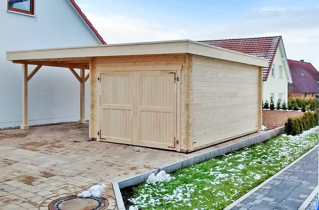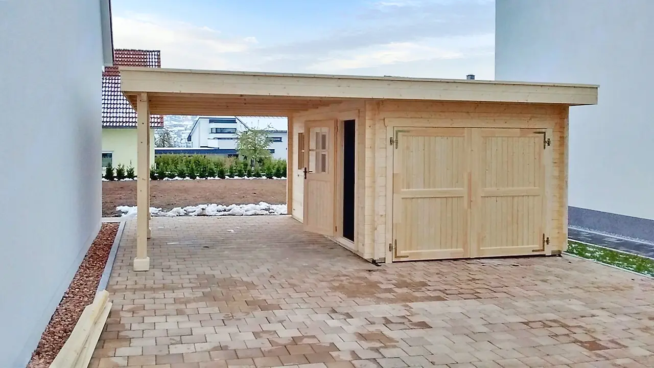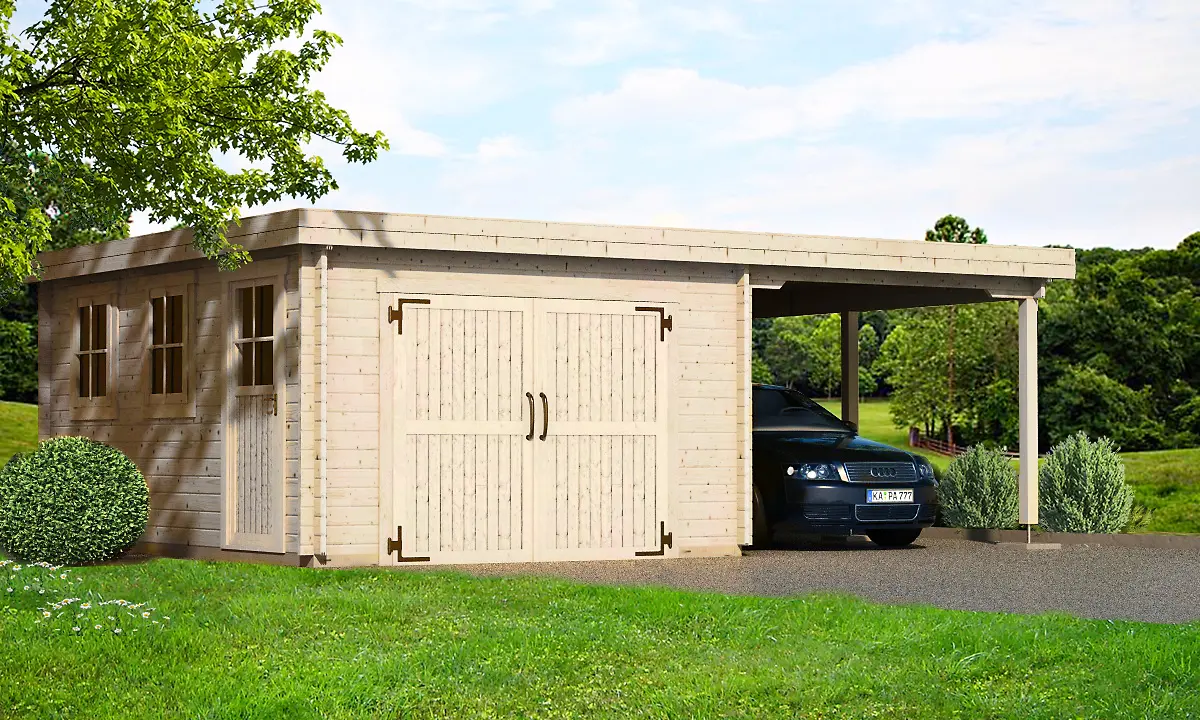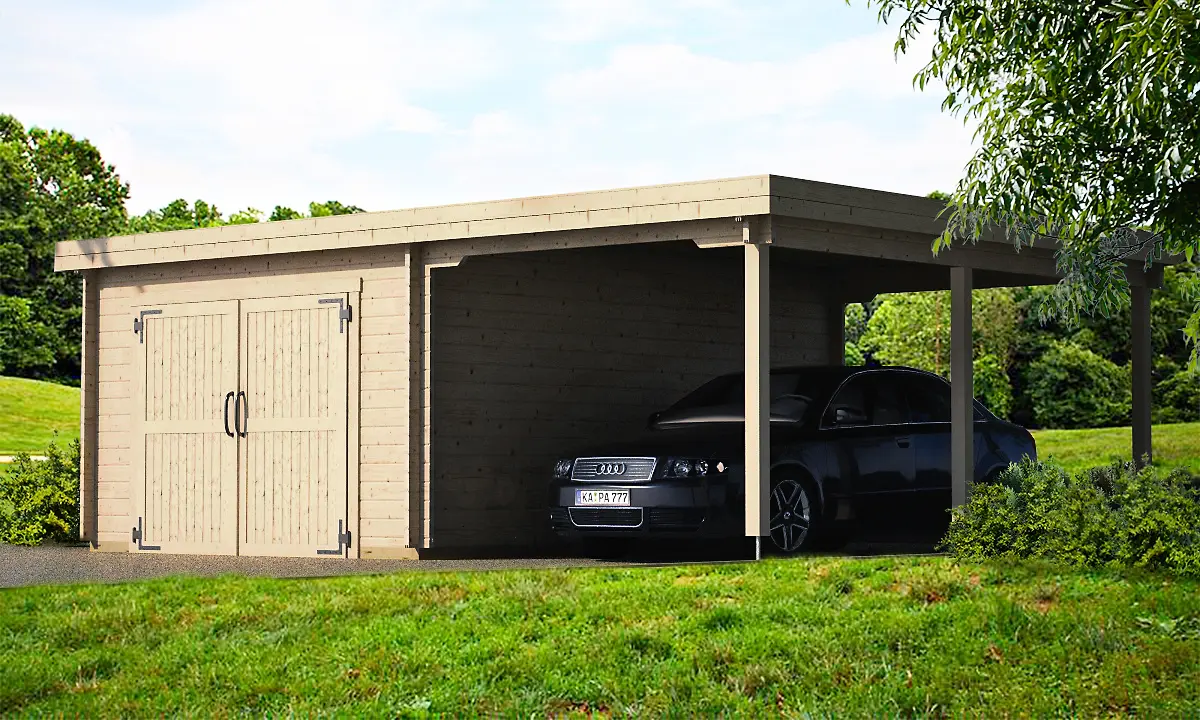 The KROKUS+ combination unit features a fully enclosed timber garage paired with an integrated carport, offering both secure storage and open parking in one structure. Its gabled roof and solid wood construction ensure durability and weather protection. Ideal for residential or commercial use, this model supports different sized configurations – making it a flexible solution for multi-purpose vehicle shelter.