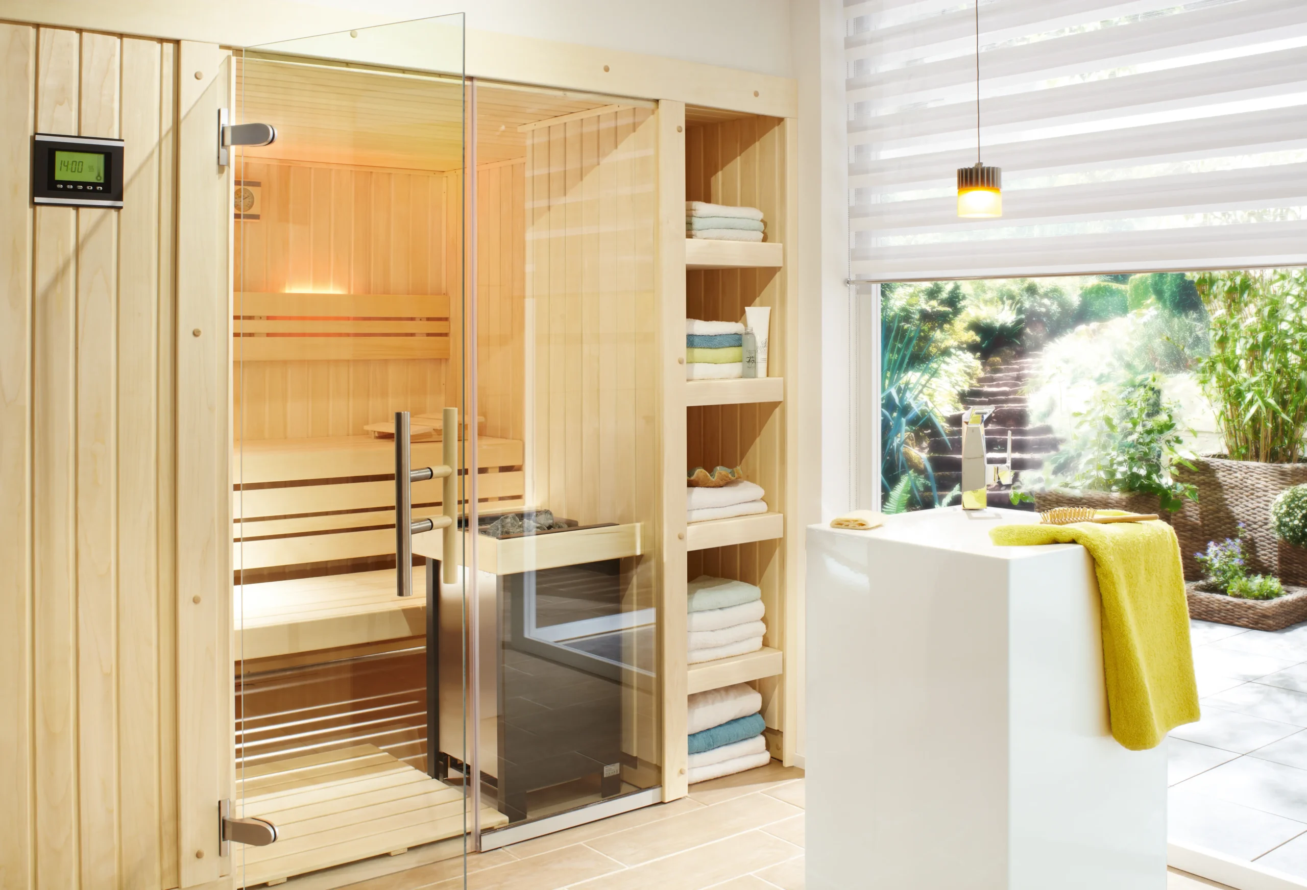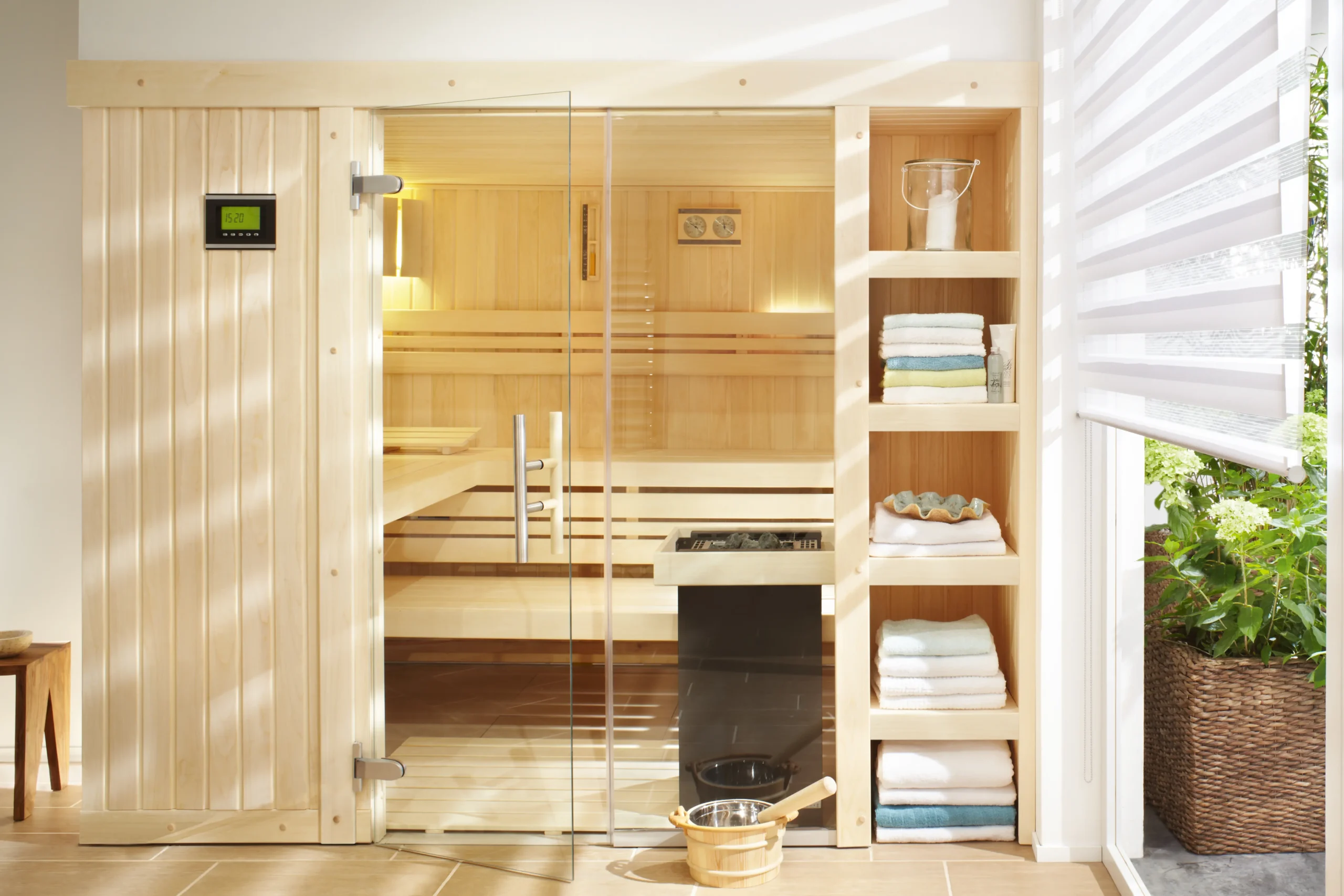 The LUCA indoor sauna blends Scandinavian-inspired design with premium comfort and practical storage. Part of the LauraLine® series, it features a minimalist aesthetic with vertical timber accents, a spacious interior, and a built-in exterior shelving unit-perfect for towels, oils, or décor. Available in multiple sizes, LUCA adapts easily to different room layouts, making it a refined and flexible choice for home spas or boutique wellness spaces.