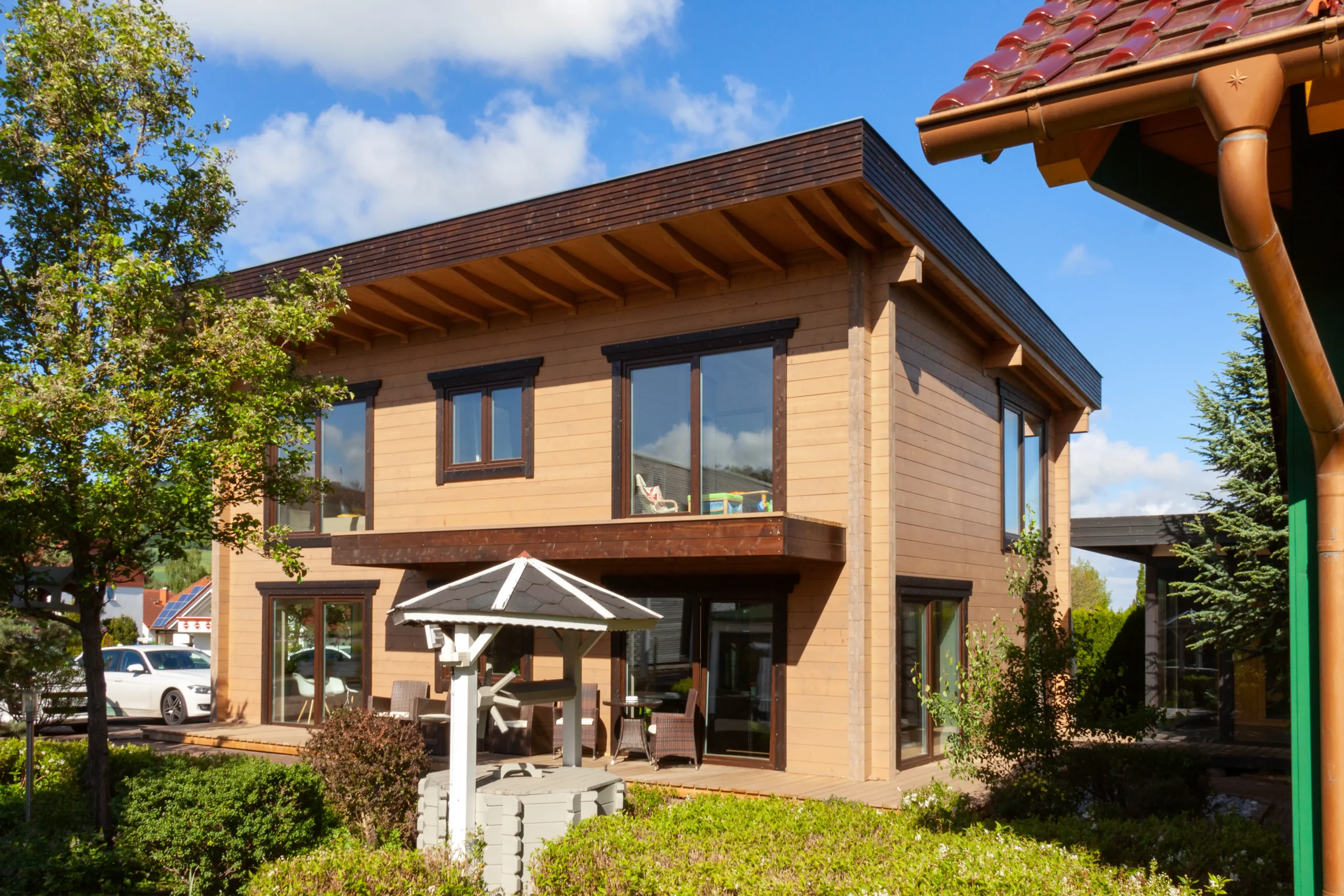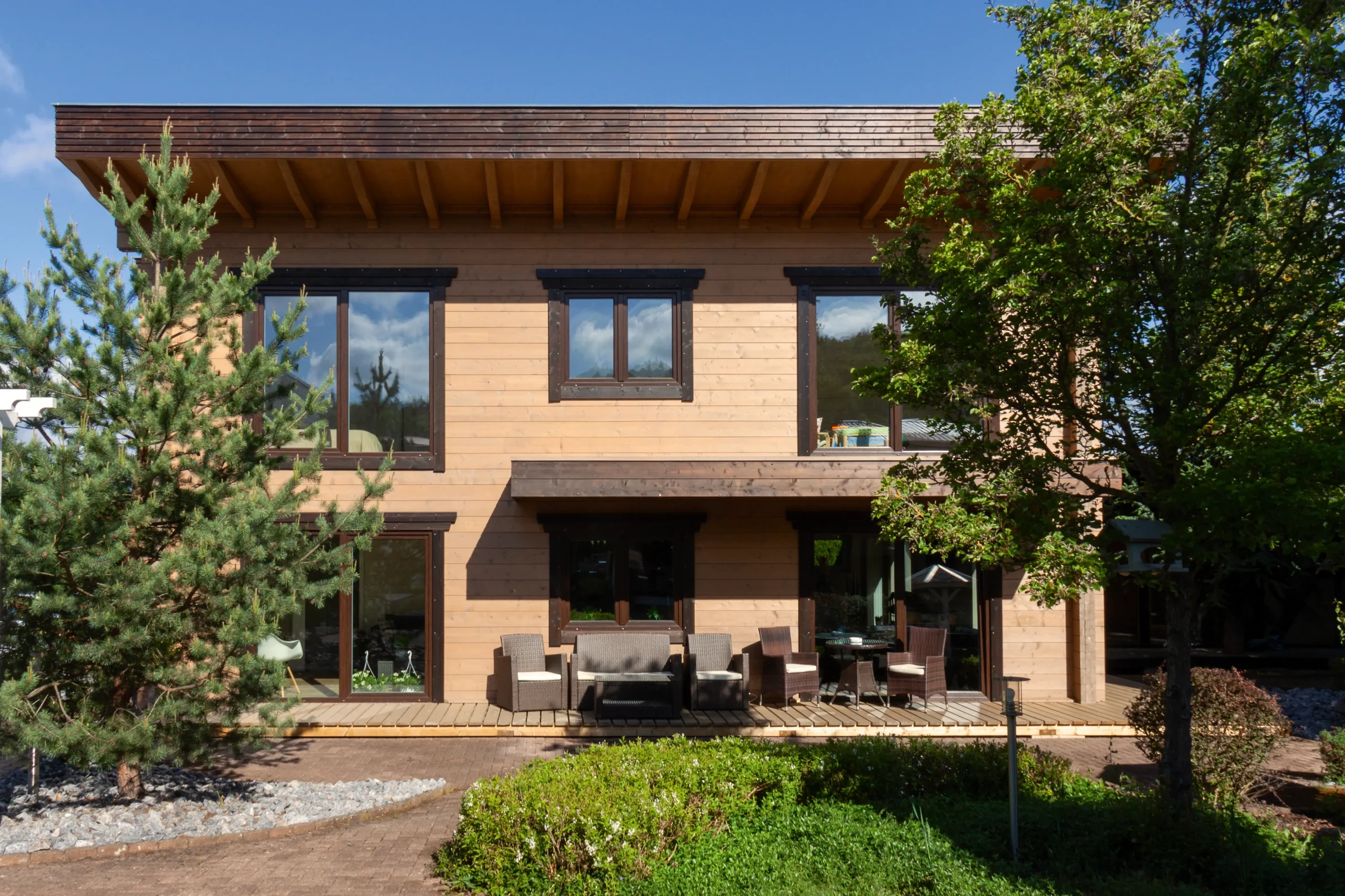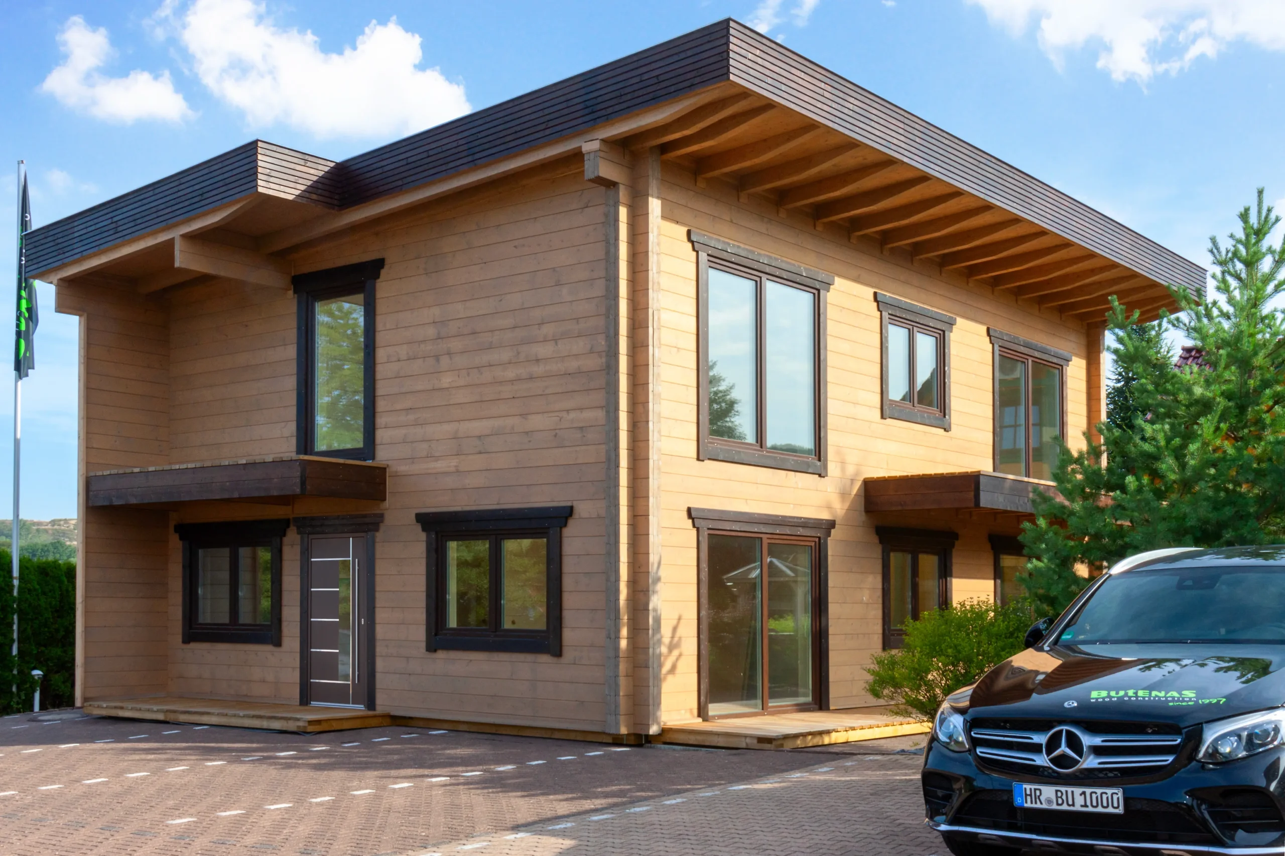 The LUKAS is a premium timber blockhouse that combines modern architecture with exceptional functionality. Its flat-roof design and full-length windows create a sleek, contemporary look that fits seamlessly into both urban and natural environments. With 140 m² of living space, the layout includes a spacious open-plan living area, three bedrooms, an office or guest room, two bathrooms, and a dedicated laundry room. Two balconies and a backyard terrace extend the living experience outdoors. Built with double-walled insulated timber, LUKAS offers year-round comfort and energy efficiency-ideal for discerning homeowners seeking a refined, future-ready residence.