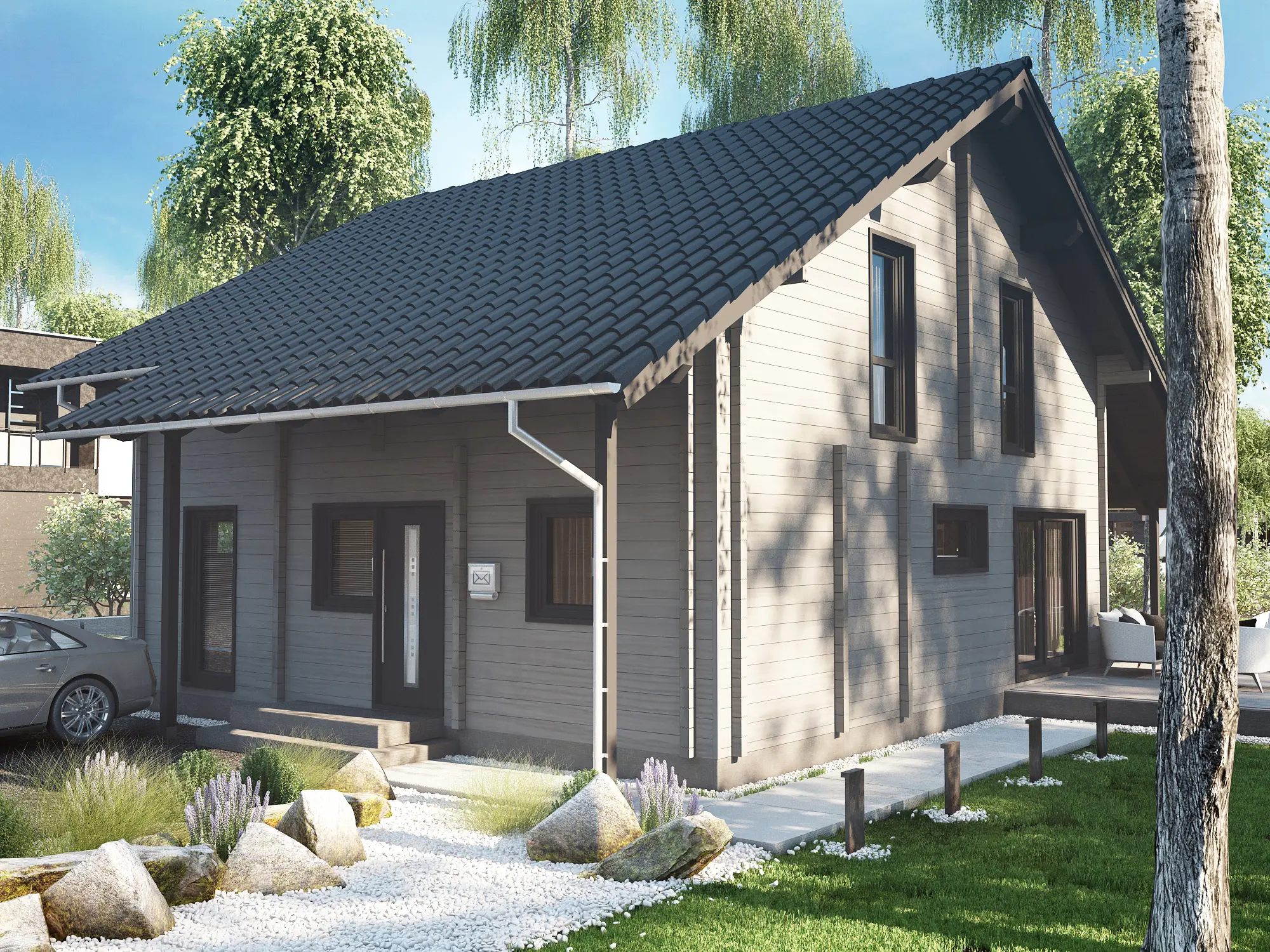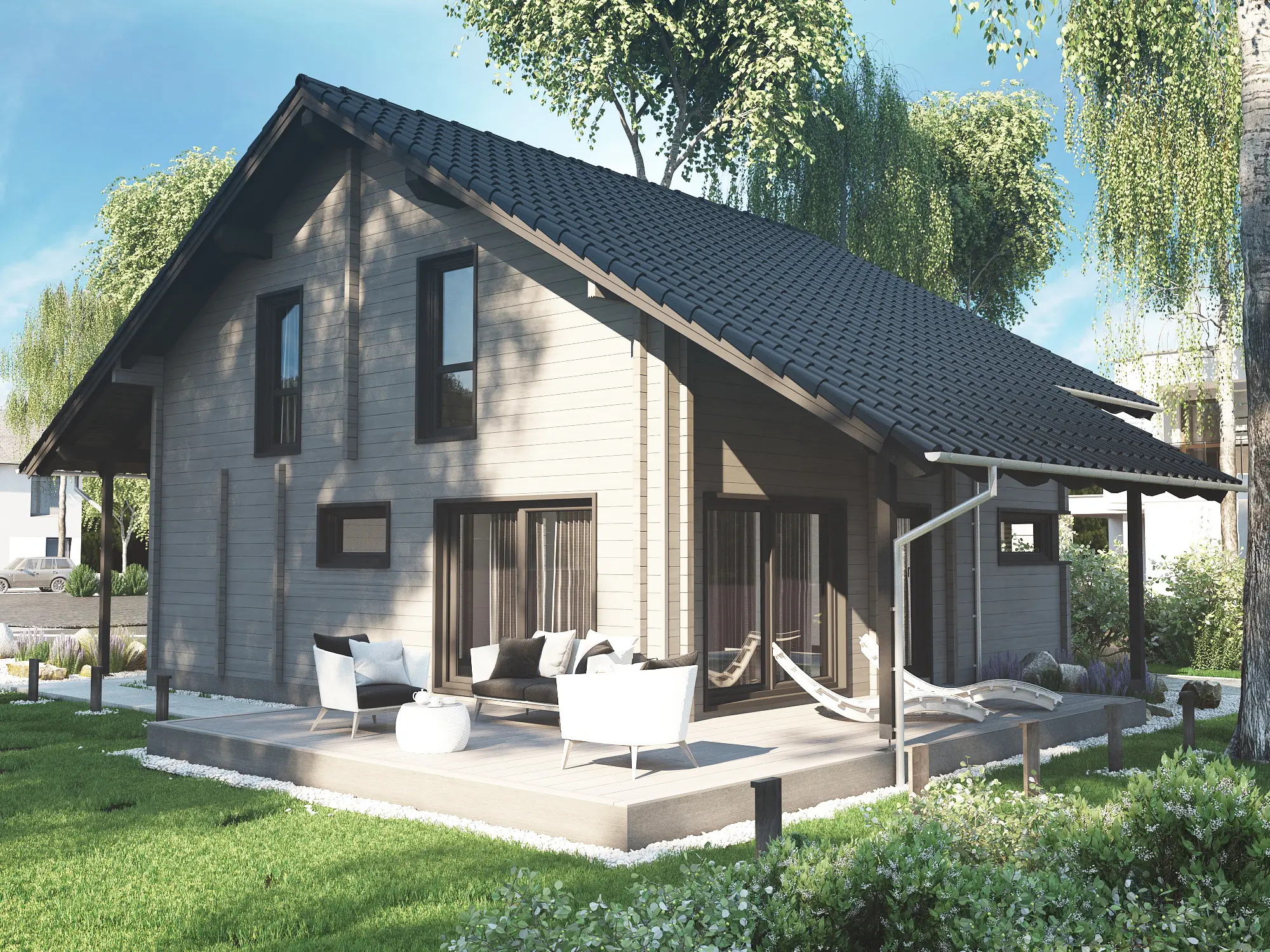 The PATRICK is a modern timber blockhouse designed for year-round residential comfort. Its contemporary layout features a well-organized interior and large windows that flood the living spaces with natural light. A shaded backyard terrace extends the living area outdoors, offering a perfect spot for relaxation or dining. With its durable construction and clean architectural lines, PATRICK is ideal for private plots or nature-integrated developments seeking a balance of style and functionality.