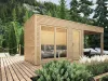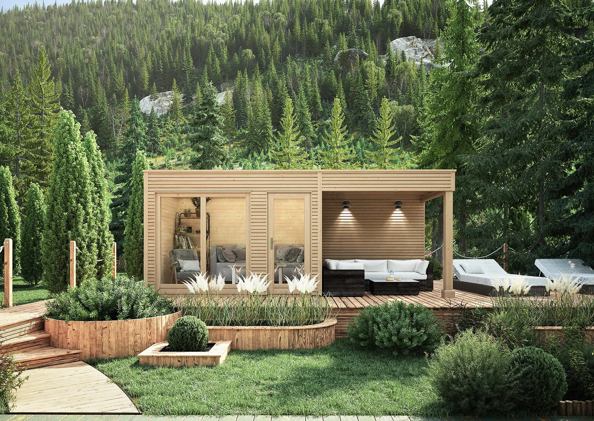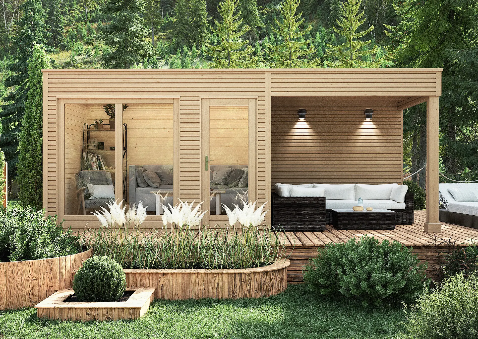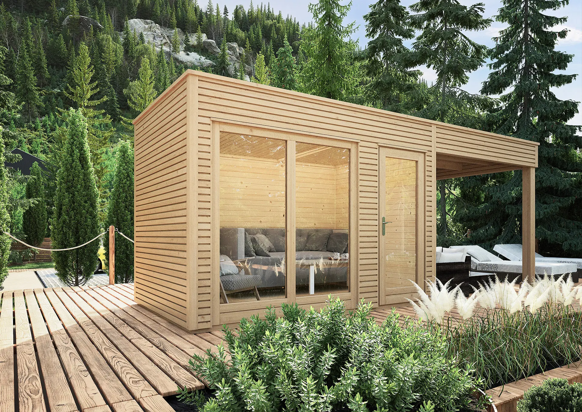 The SUN-V+ garden house builds on the original with the addition of a shaded outdoor area, perfect for relaxing or entertaining. Its flat roof, natural wood paneling, and full insulation provide a sleek, modern look with year-round usability. Ideal for use as a garden lounge, outdoor office, or hospitality suite, SUN-V+is a versatile solution for contemporary outdoor living and commercial applications.