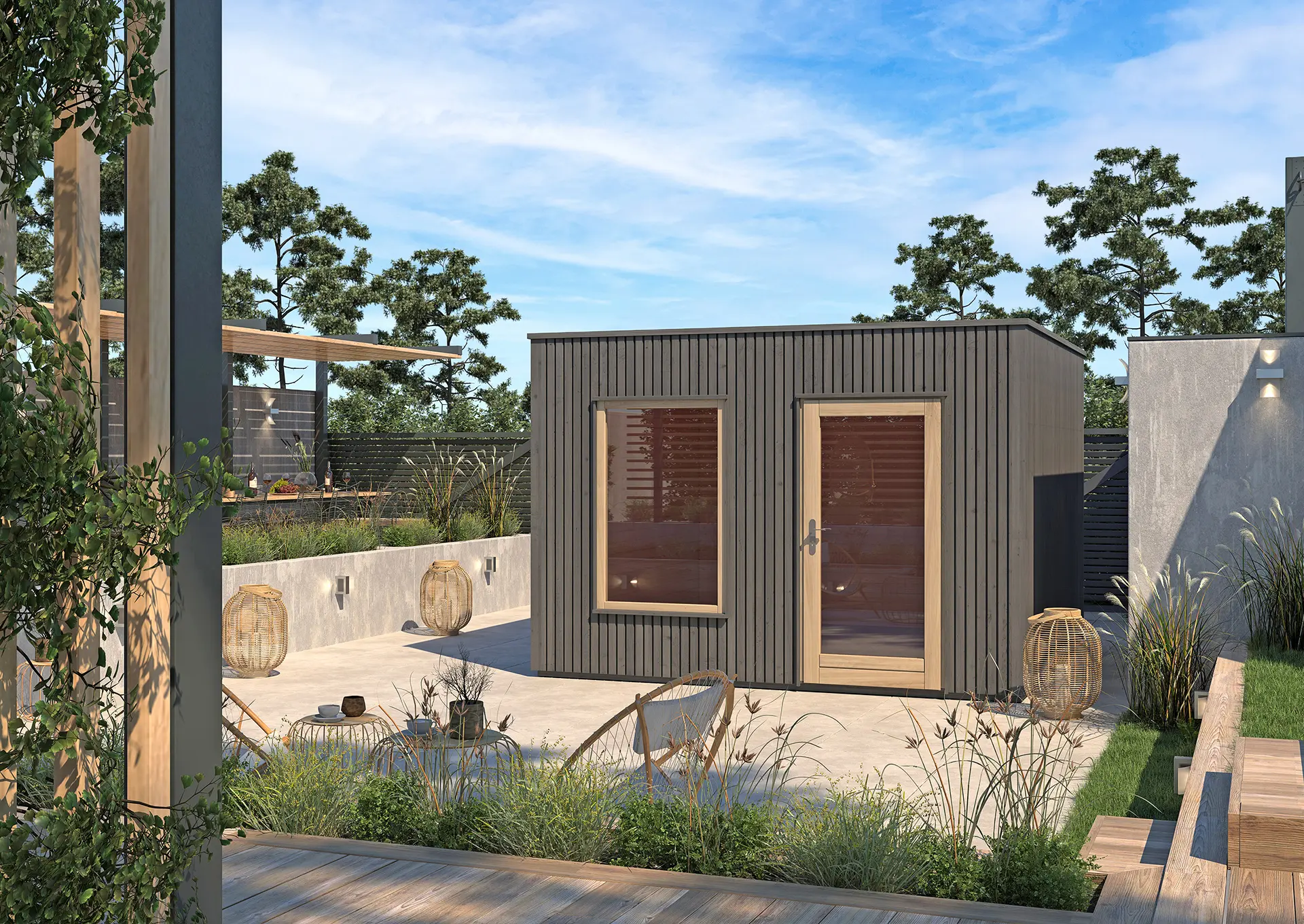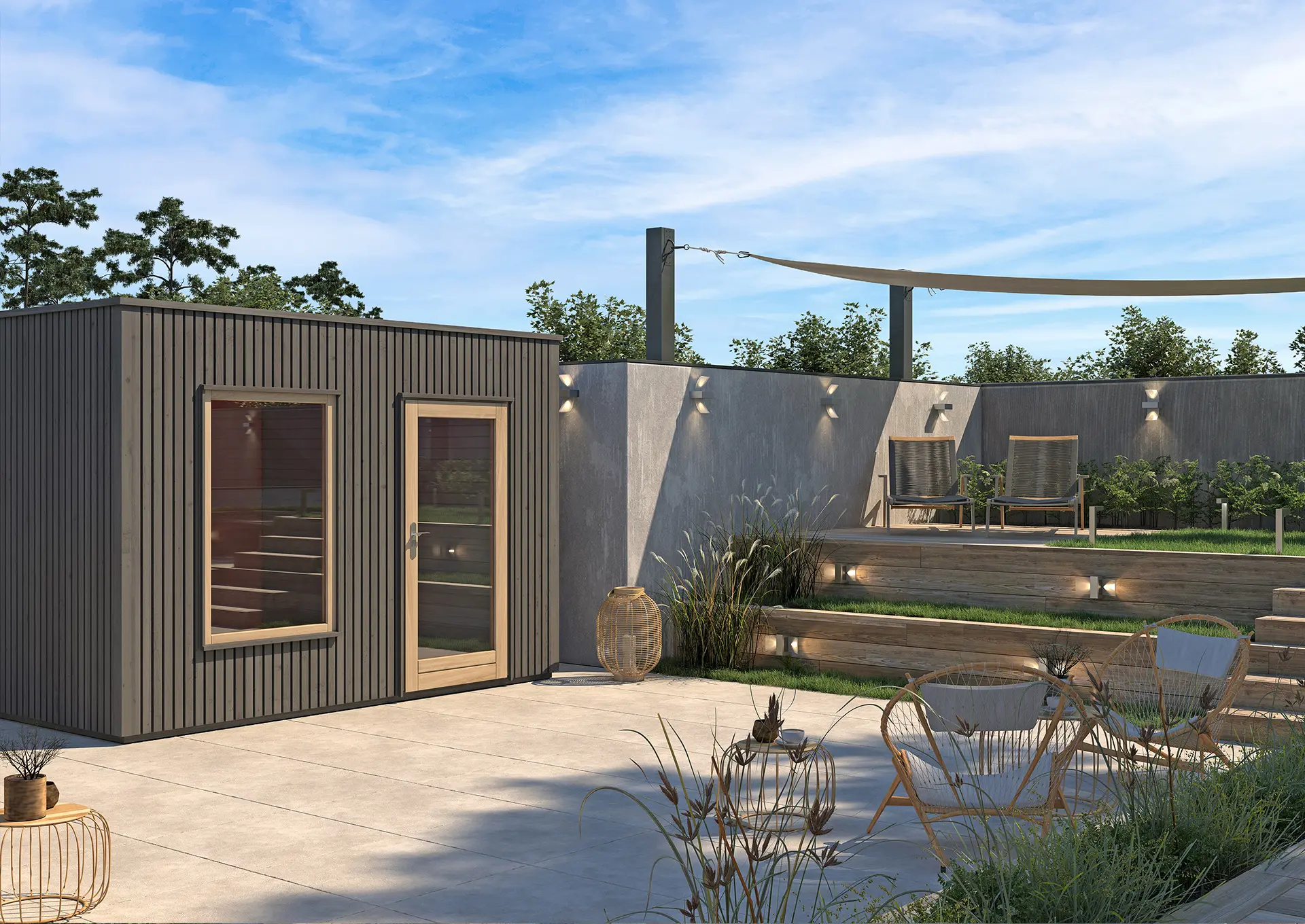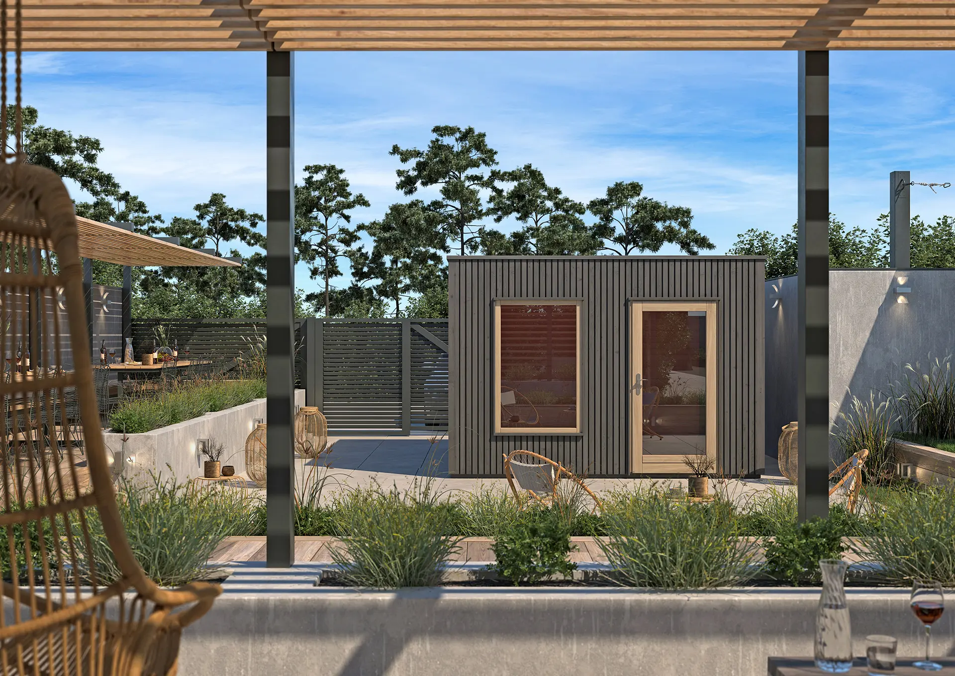 The SUNNY-S is a modular garden sauna available in multiple sizes to suit various outdoor layouts. Featuring vertical timber cladding, a flat roof, and large windows, it offers a bright, modern aesthetic. The layout includes a separate antechamber for changing or storage, enhancing comfort and functionality. Ideal for residential gardens or wellness spaces, SUNNY-S combines flexibility, privacy, and contemporary design.