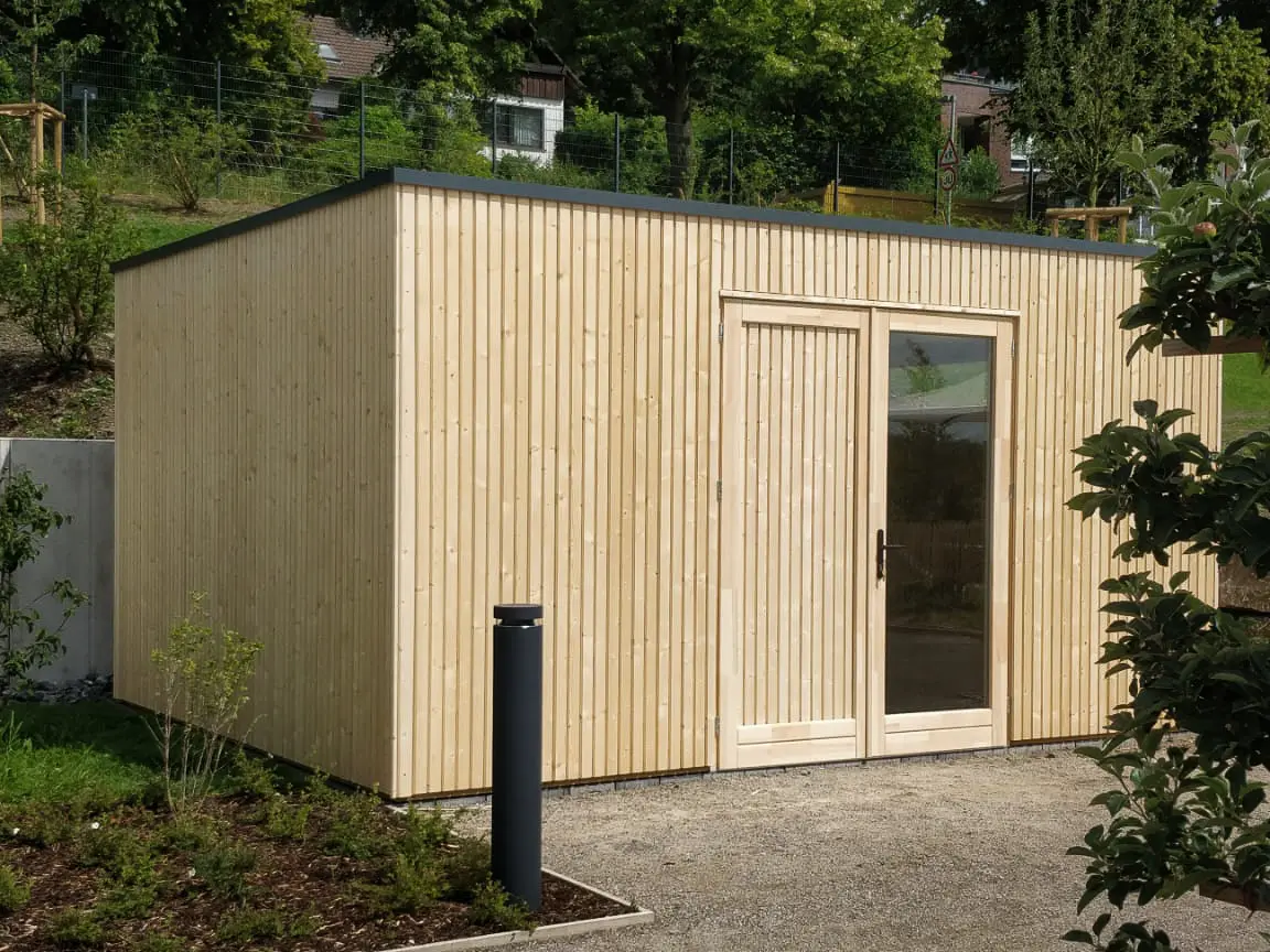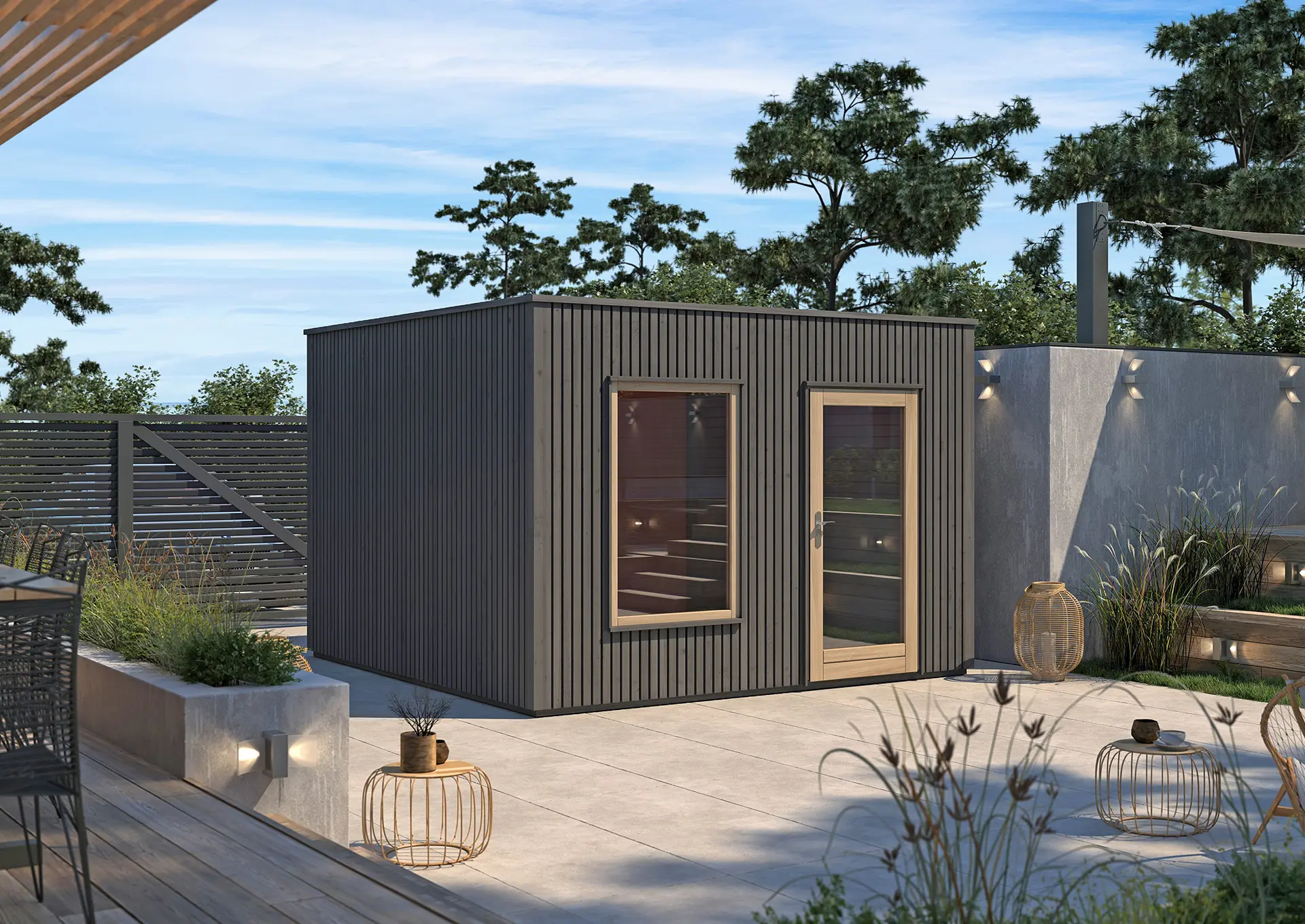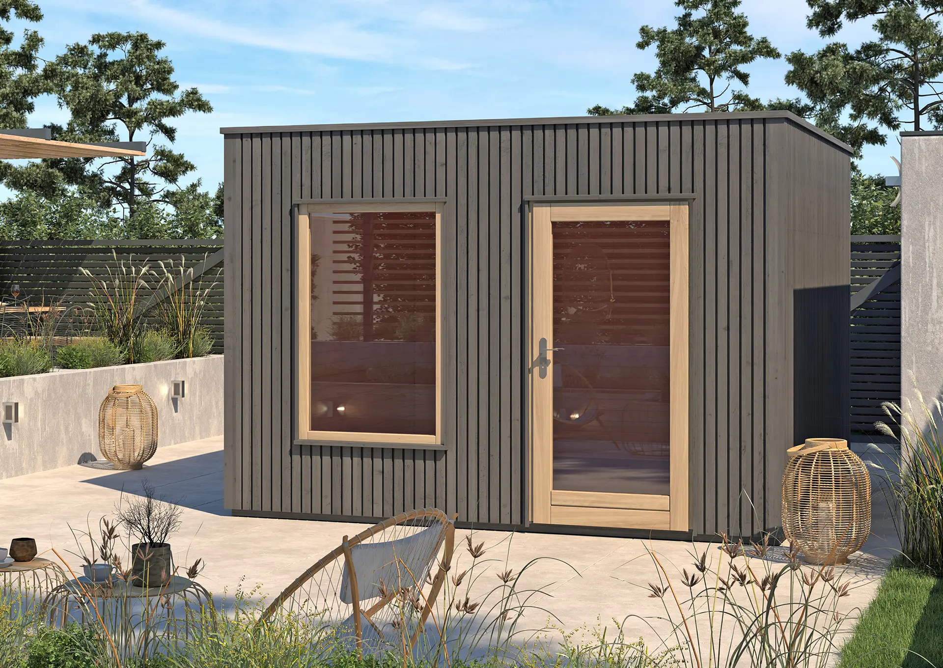 The SUNNY-S is a modular garden sauna available in multiple sizes to suit various outdoor layouts. Featuring vertical timber cladding, a flat roof, and large windows, it offers a bright, modern aesthetic. The layout includes a separate antechamber for changing or storage, enhancing comfort and functionality. Ideal for residential gardens or wellness spaces, SUNNY-S combines flexibility, privacy, and contemporary design.