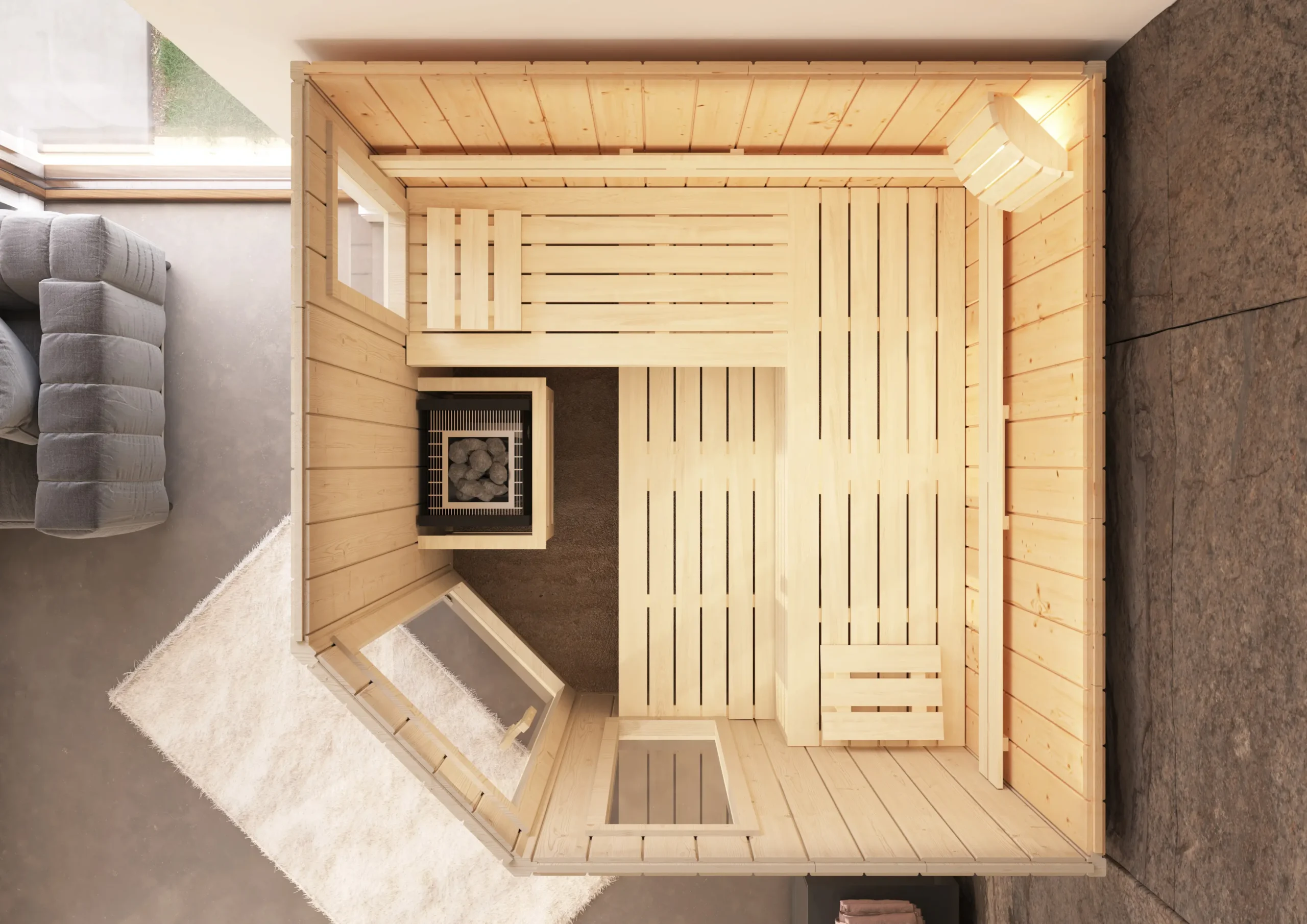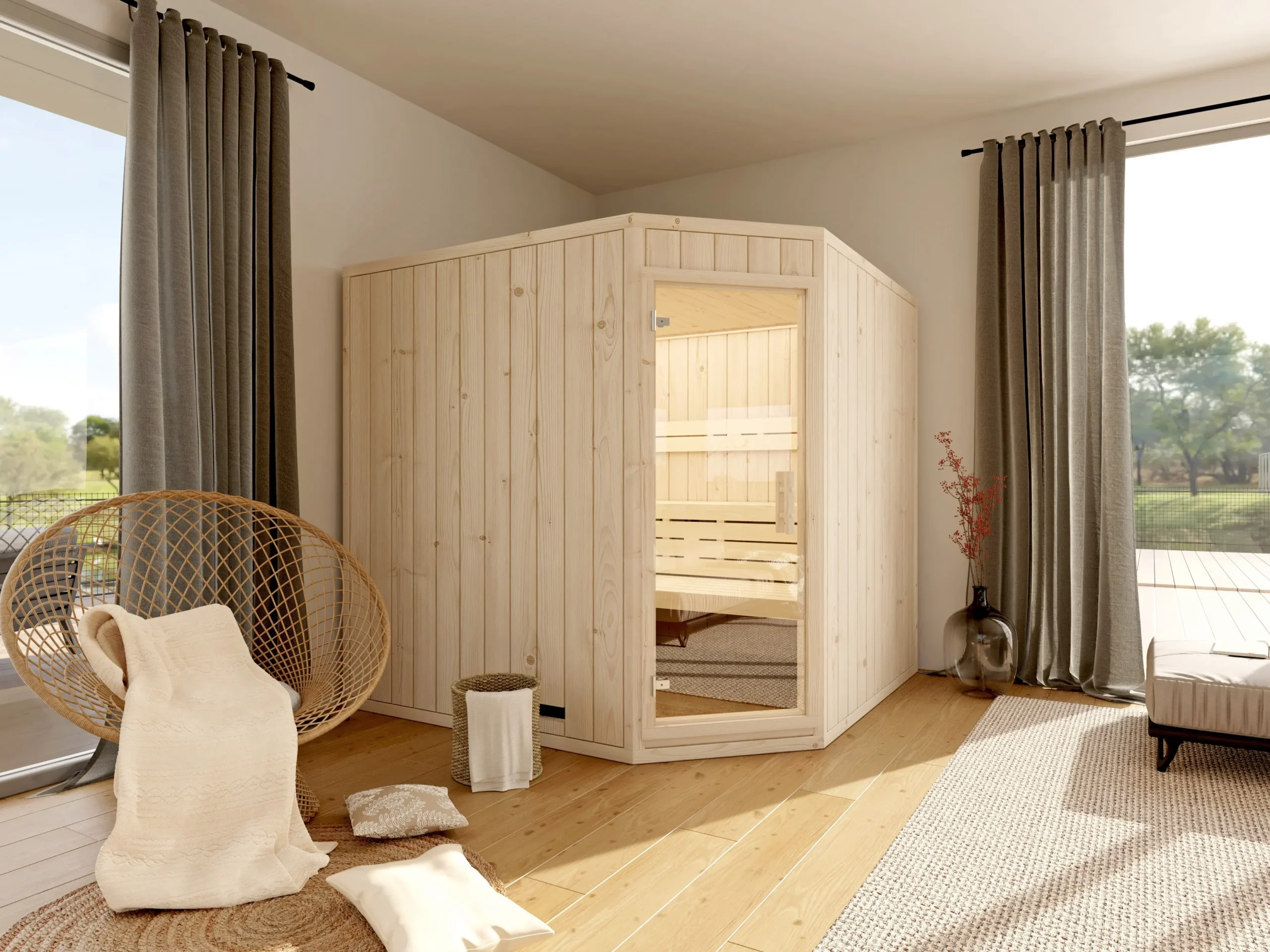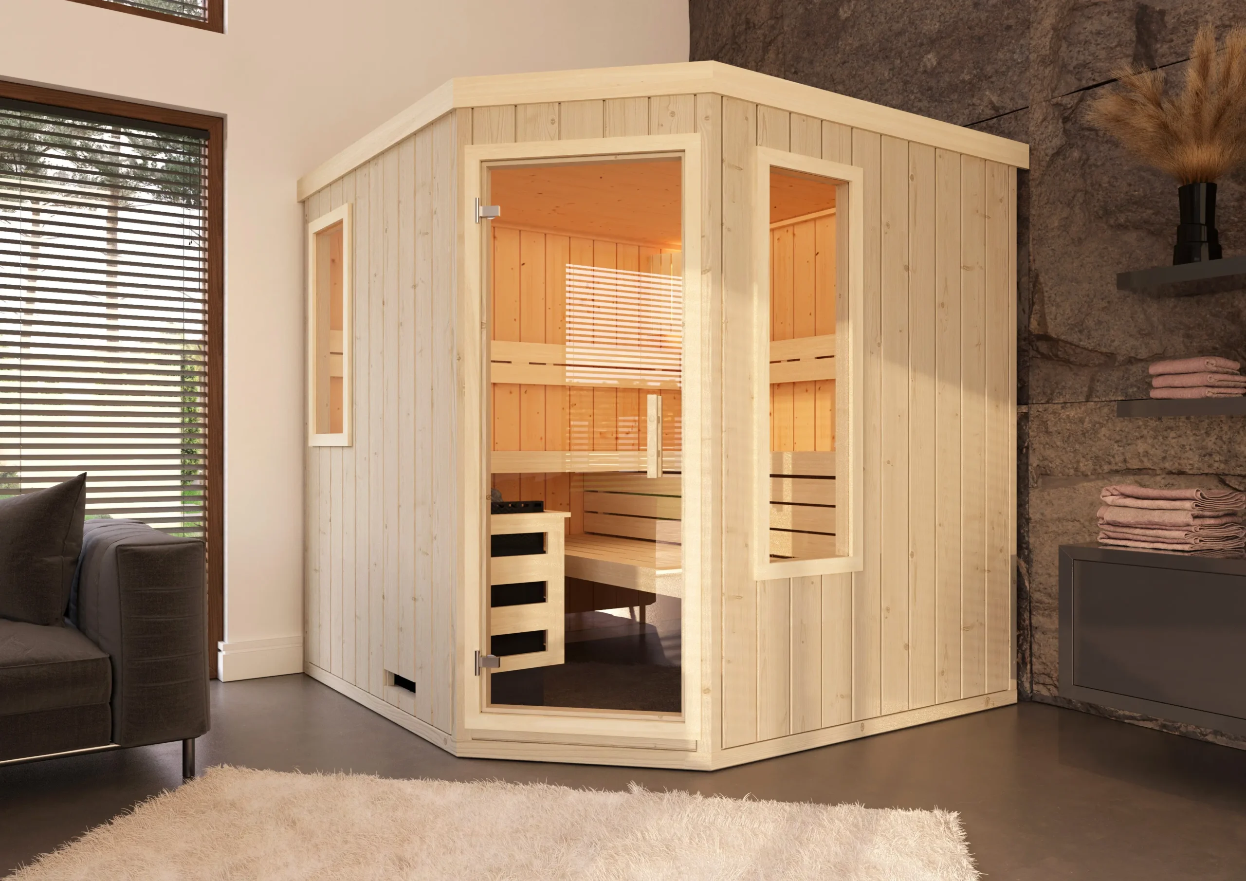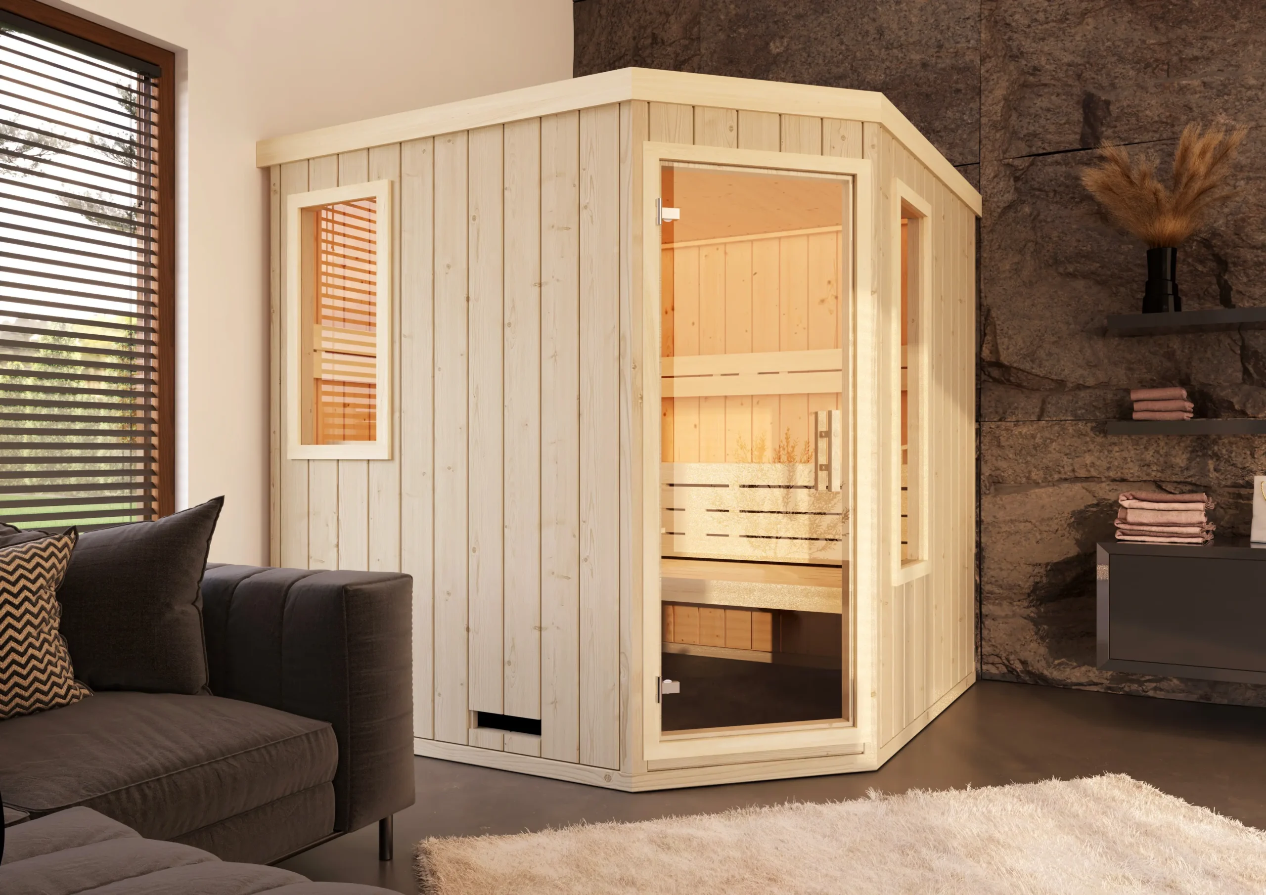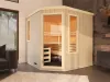 The TYLA-C is a corner sauna that makes the most of limited space without compromising on comfort or style. Its five-sided layout fits neatly into room corners, while the natural wood interior and ergonomic bench setup create a cozy, inviting atmosphere. With flexible installation options and a clean, modern look, it’s a smart choice for home wellness areas.