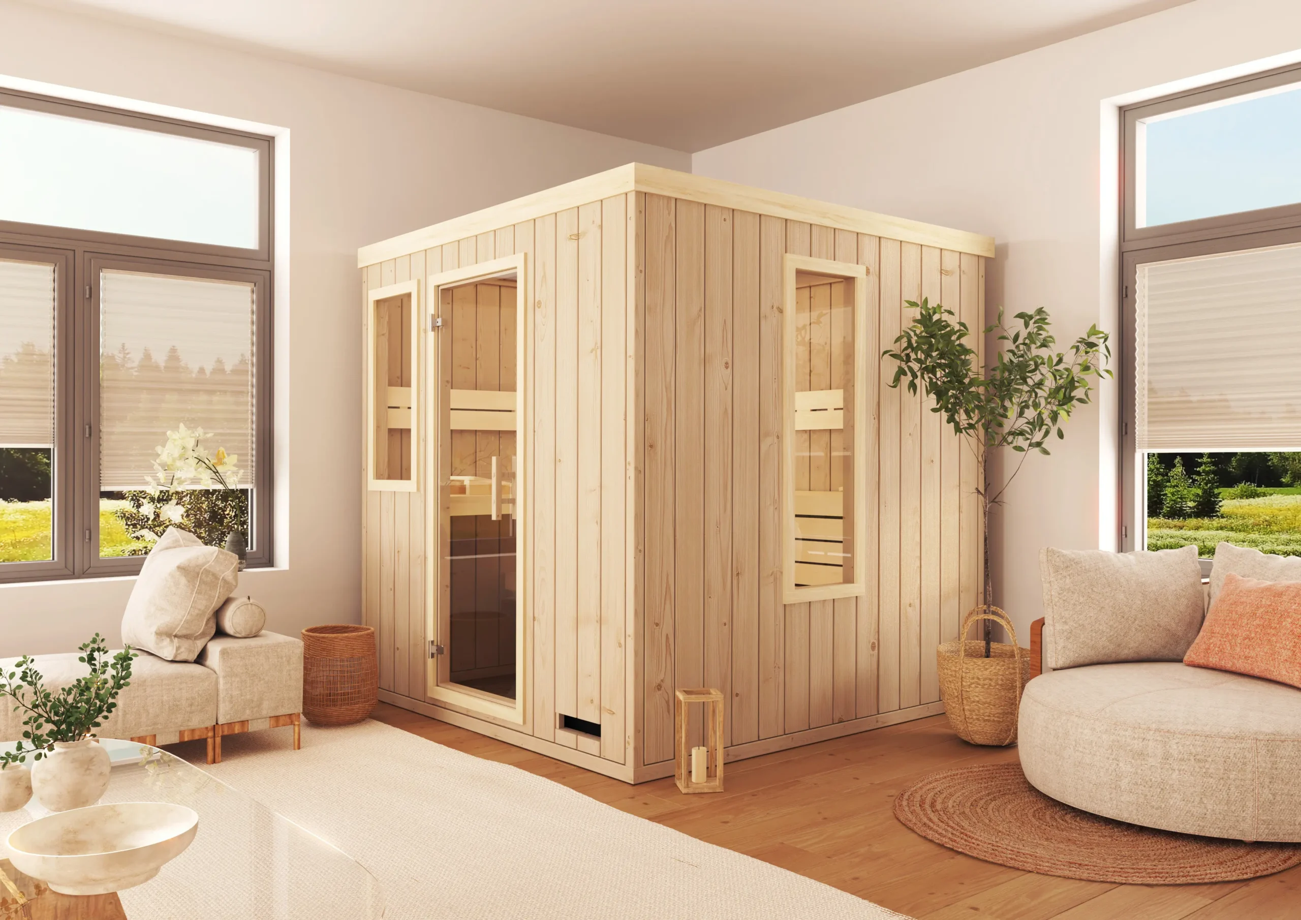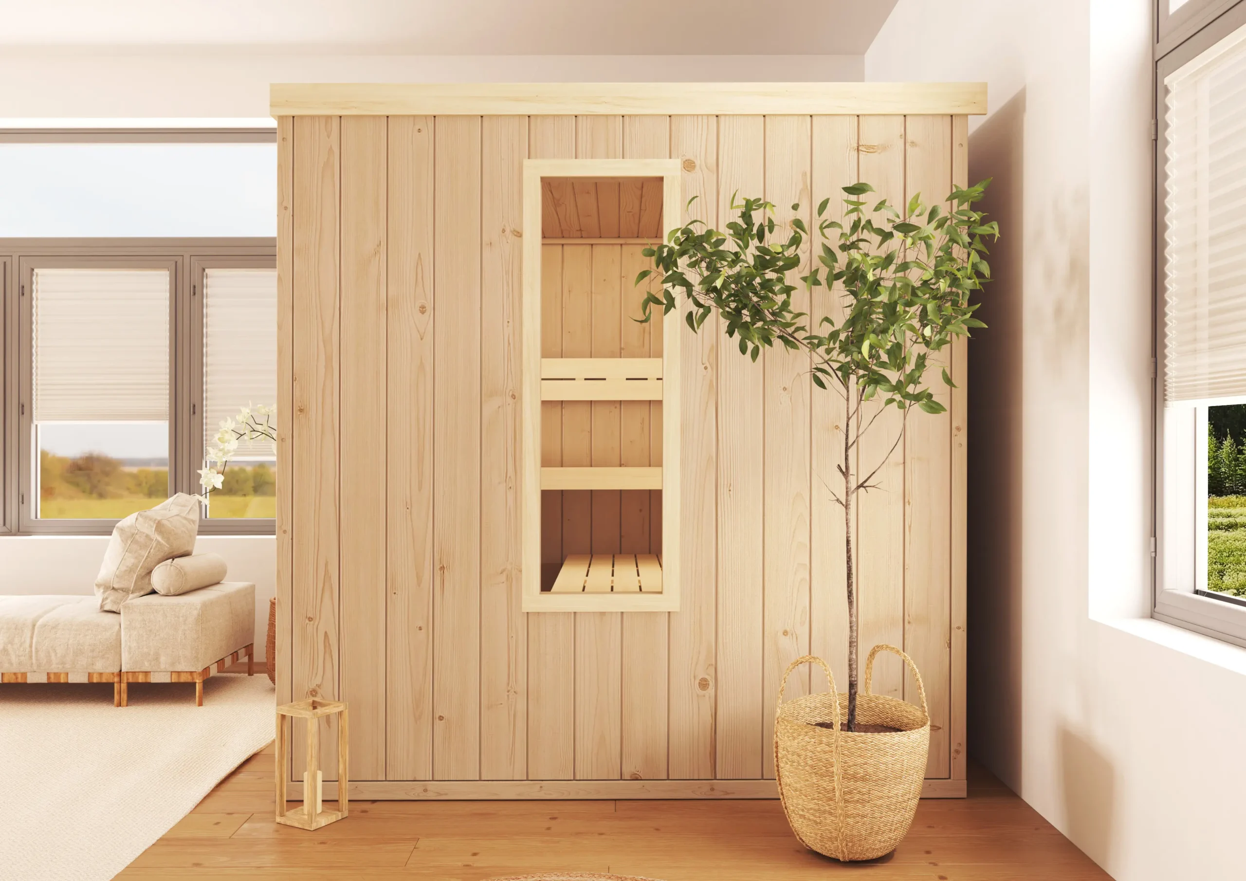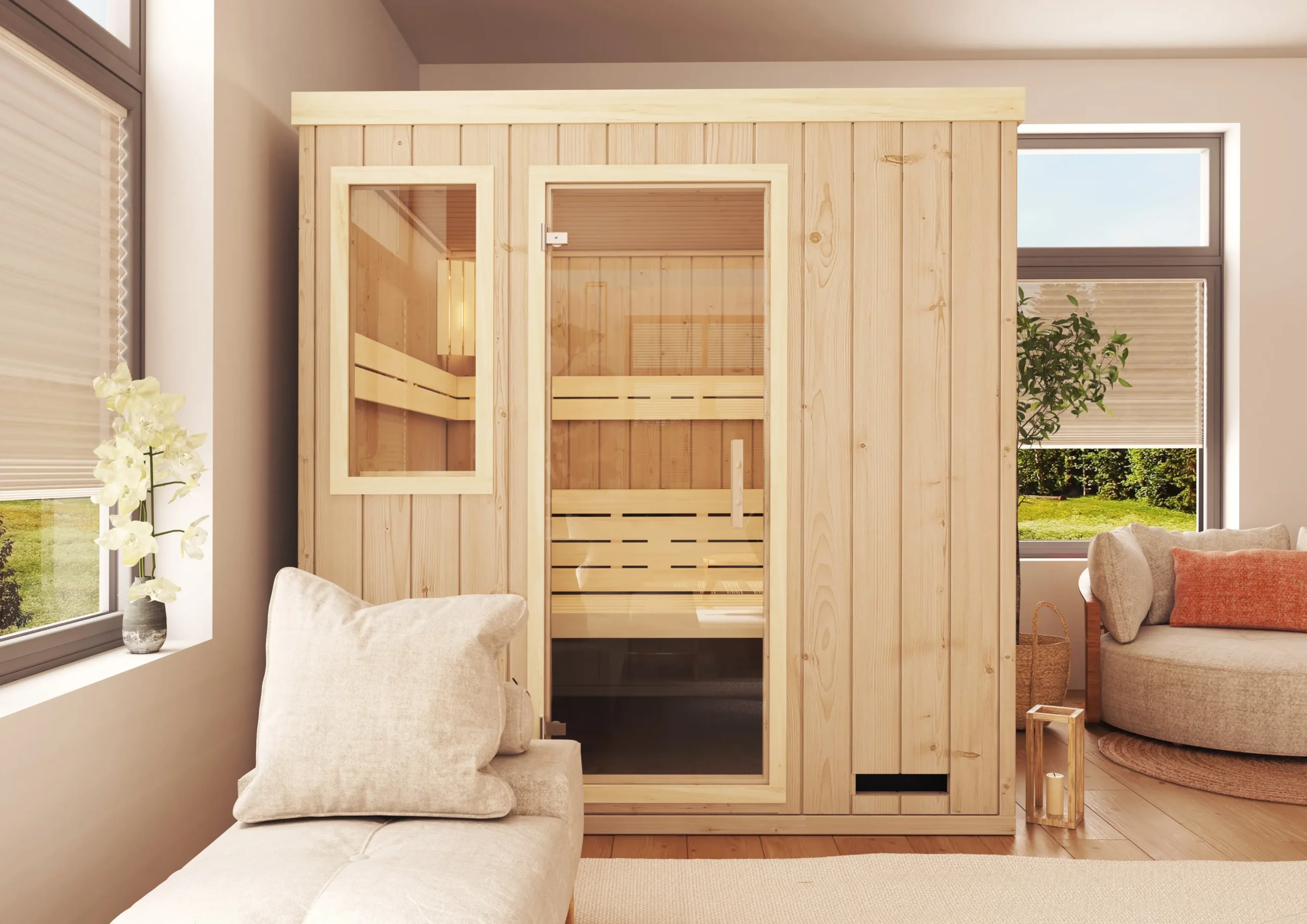 The TYLA-G is a modern indoor sauna that combines natural wood construction with a sleek, full-width glass front for a bright and open feel. Designed for comfort and visual appeal, it features a spacious interior with ergonomic benches and softwood finishes that enhance relaxation. Ideal for contemporary wellness spaces, this model brings together timeless sauna tradition and modern design.
