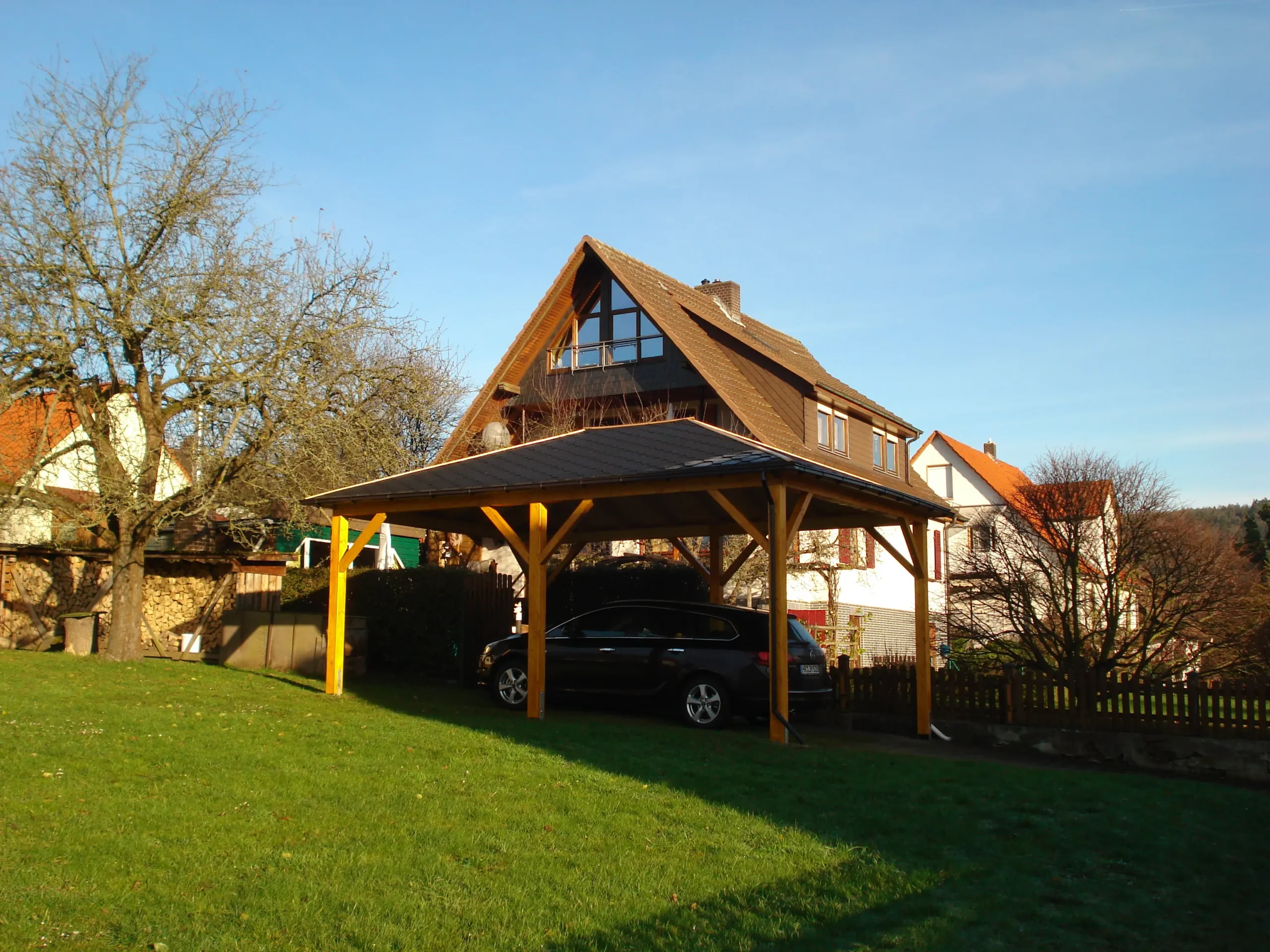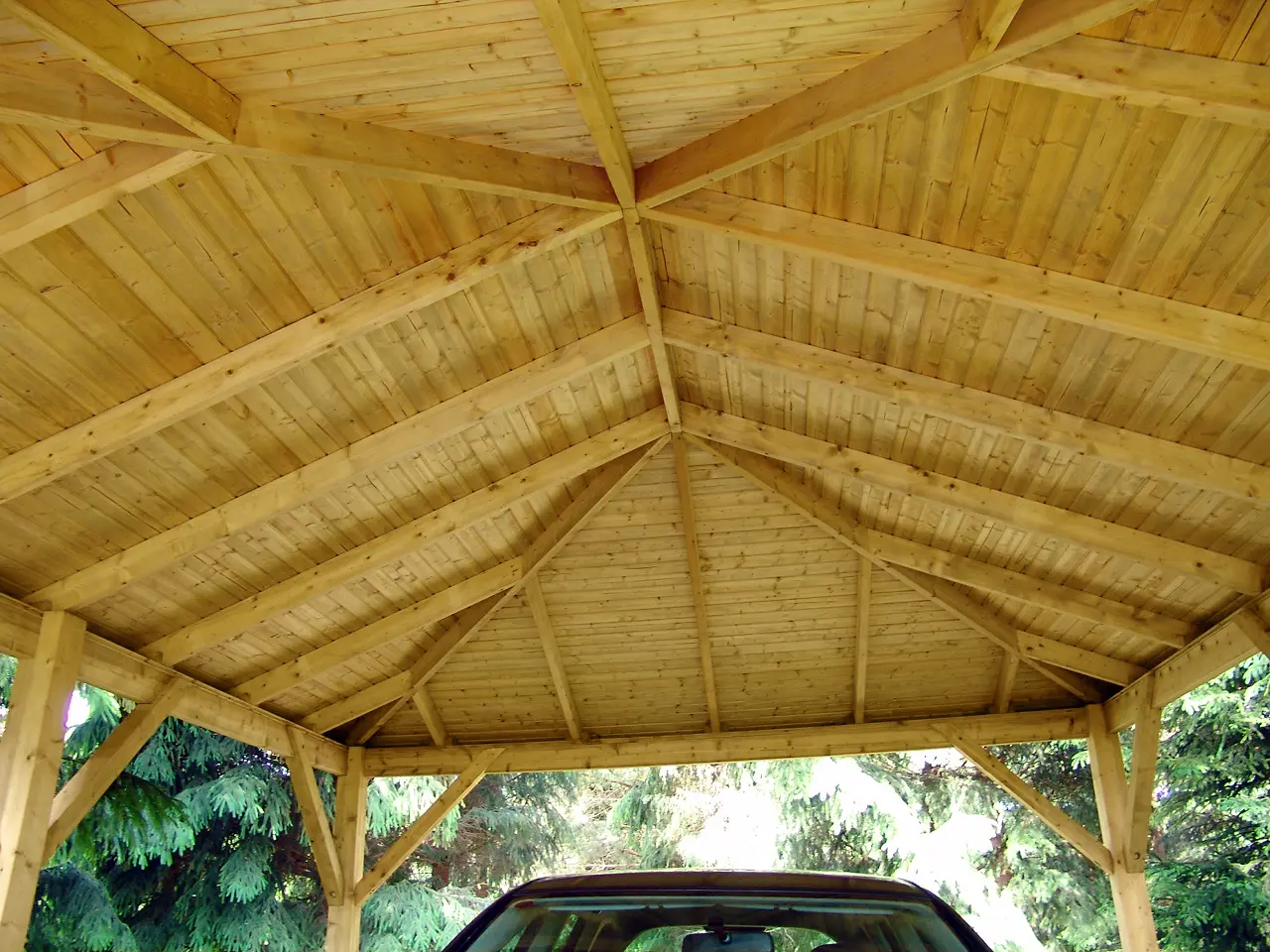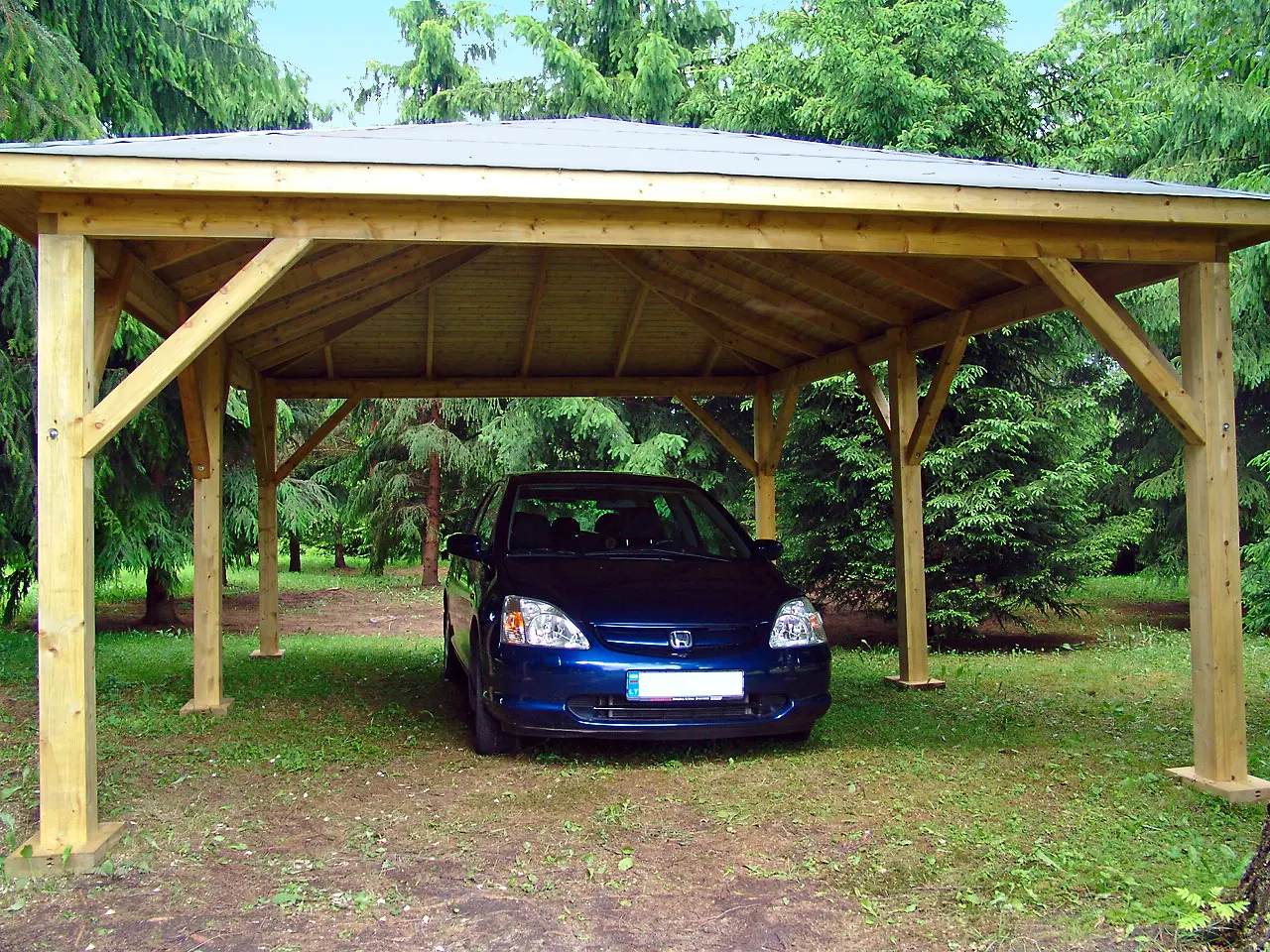 The UMBRA carport is a durable timber structure designed to provide reliable year-round protection for vehicles. Its hip roof ensures effective water drainage, while the solid wood frame offers long-term stability and weather resistance. Ideal for residential driveways or commercial parking areas, UMBRA combines practical coverage with a clean, traditional look. Optional side panels and extensions allow for customized configurations to suit various site requirements.